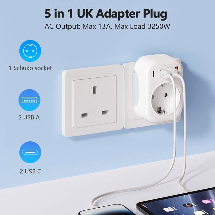 Compacts et légers, ils se glissent facilement dans votre bagage à main, prêts à être utilisés dès votre arrivée. Adaptateur Prise International Adaptateur Universel Adaptateur De Voyage Britannique Vers Européen, Convertisseur De Prise Adaptateur Usa Adaptateur De Voyage Universel Prise : Chaque adaptateur de voyage est équipé d'un fusible de 13A pour une utilisation maximale jusqu'à 3250 watts. Adaptateur Voyage Uk Adaptateur Prise Universelle Pack De 3 Adaptateurs UK - Europe Vers Angleterre/Irlande - Type G - 250V/16A Max Adaptateur électrique Angleterre Multiprise Usb Conçus spécialement pour les prises de type Schuko, ces adaptateurs sont indispensables pour tous ceux qui prévoient de visiter le Royaume-Uni depuis des pays comme l'Allemagne, la France et d'autres régions d'Europe. Avec ces adaptateurs, vous êtes toujours prêts pour l'aventure ! 2X Adaptateur Voyage Afrique Du Sud - Adaptateur Compact Pour Fiche... Design Compact : Fabriqués en ABS avec des broches métalliques, ces adaptateurs sont compacts pour être facilement transportés dans vos bagages. Adaptabilité Mondiale : Ces adaptateurs de voyage vous permettent de connecter vos appareils avec des prises EU (Type C & F) à une prise murale du Royaume-Uni (Type G). ADAPTATEUR POUR : Prise sans terre type A pour les pays comme États-Unis, République Dominicaine, Japon, Canada, Mexique, Thaïlande, Liban, Laos, Cuba, Vietnam, Maldives, Açores (liste non-exhaustive). PLUSIEURS FICHES : L'adaptateur de voyage est conçu pour la prise murale sans terre américaine avec broches et peut recevoir les fiches mâles sans terre européennes type C. Notez que l... Dimensions : 4,1 x 4,1 x 7,4 cm, Informations techniques : Points Forts : Conçu pour prises Schuko, Compact et léger, Lot de 2 adaptateurs Large Compatibilité : Ces adaptateurs pour l'international s'utilisent dans les destinations qui utilisent la prise murale type G, comme Angleterre, Irlande, Singapour, Hong Kong, Canada, Chypre, Jordanie, Nigeria, Tanzanie, Vietnam, etc. Prêt pour votre voyage au Royaume-Uni ? Démarrez votre aventure avec notre lot de 2 adaptateurs de voyage pour le Royaume-Uni ! Multiples Appareils : Chaque adaptateur prise france vers angleterre permet de charger une variété d'appareils, tels que smartphones, tablettes, power banks, ordinateurs portables, et appareils photo.