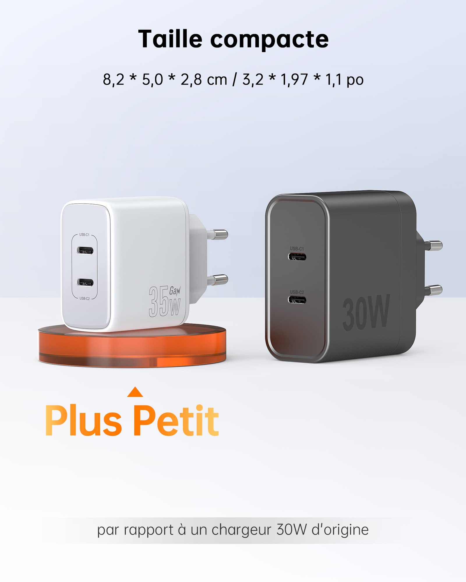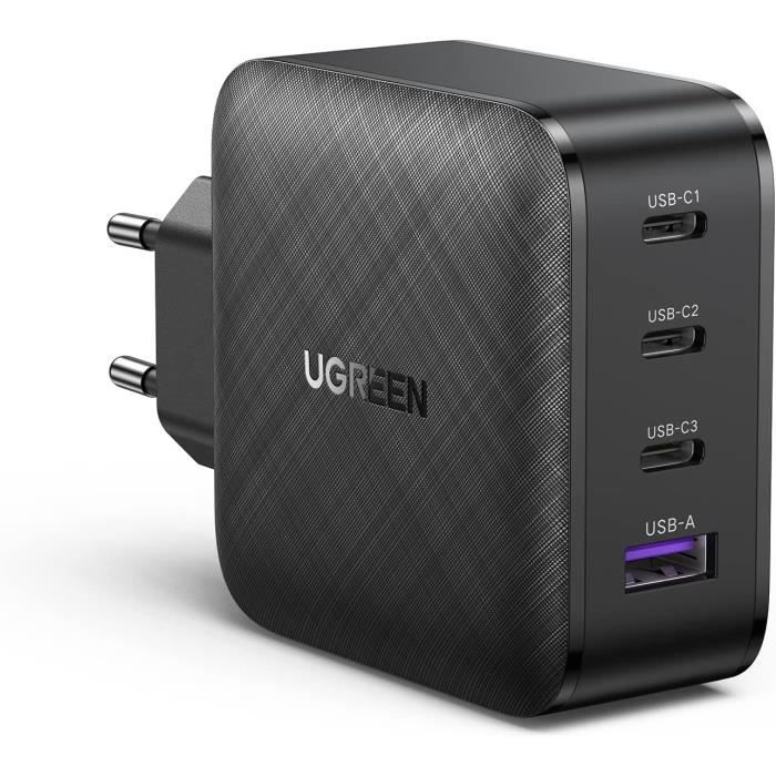 Chargeur 4 Ports USB-C USB-A 65W 4 Ports Chargeur Usb C Rapide Compatible Avec Macbook Pro Air Ipad Chargeur Samsung Charge Rapide UGREEN CHARGEUR 65W Gan Rapide 4-Port USB C Mural Puissance Adaptateur Chargeur USB C 65W, Charge Rapide PD3.0 PPS, GaN II avec Câble Tressé 2M, Compatible pour MacBok Pro/Air, pour Samsung Galaxy S25/S24/S23/S22 Ultra, pour iPhone... Cette longueur étendue offre la flexibilité nécessaire pour organiser vos appareils selon votre convenance tout en chargeant avec le chargeur rapide. 【Compatibilité Universelle & Chargement Multi-Appareils】Conçu pour une large gamme d'appareils, ce chargeur GaN dispose de 4 ports (USB A+C) vous permettant de charger plusieurs appareils simultanément. Qu'il s'agisse d'un MacBook, d'un smartphone ou d'une tablette, profitez d'une compatibilité transparente et d'une distribution intelligente de l'énergie pour une charge optimale de chaque appareil avec cette prise USB C. Chargez rapidement votre MacBook Air 13 M2 et retrouvez efficacement sa pleine puissance en seulement 1., 5 heure. Le hub de chargement USB garantit une expérience de chargement sûre et rapide pour vos gadgets, les gardant alimentés et prêts à l'emploi. 【Équipement de charge complet】Le chargeur MacBook comprend un chargeur mural rapide USB A+C à 4 ports, un cordon d'alimentation de 1,5 m et un manuel d'utilisation. Chaque chargeur USB C RG65 bénéficie d'une garantie de disponible 24/7 et d'un service client professionnel et convivial. Cette technologie garantit non seulement une charge rapide, mais rend également le chargeur USB C 65 W plus efficace. Chargez rapidement votre MacBook Air 13...