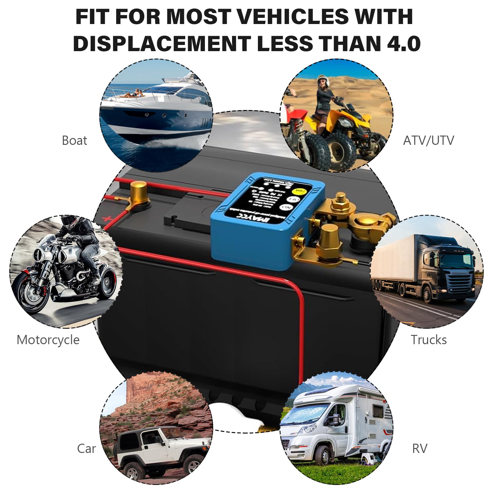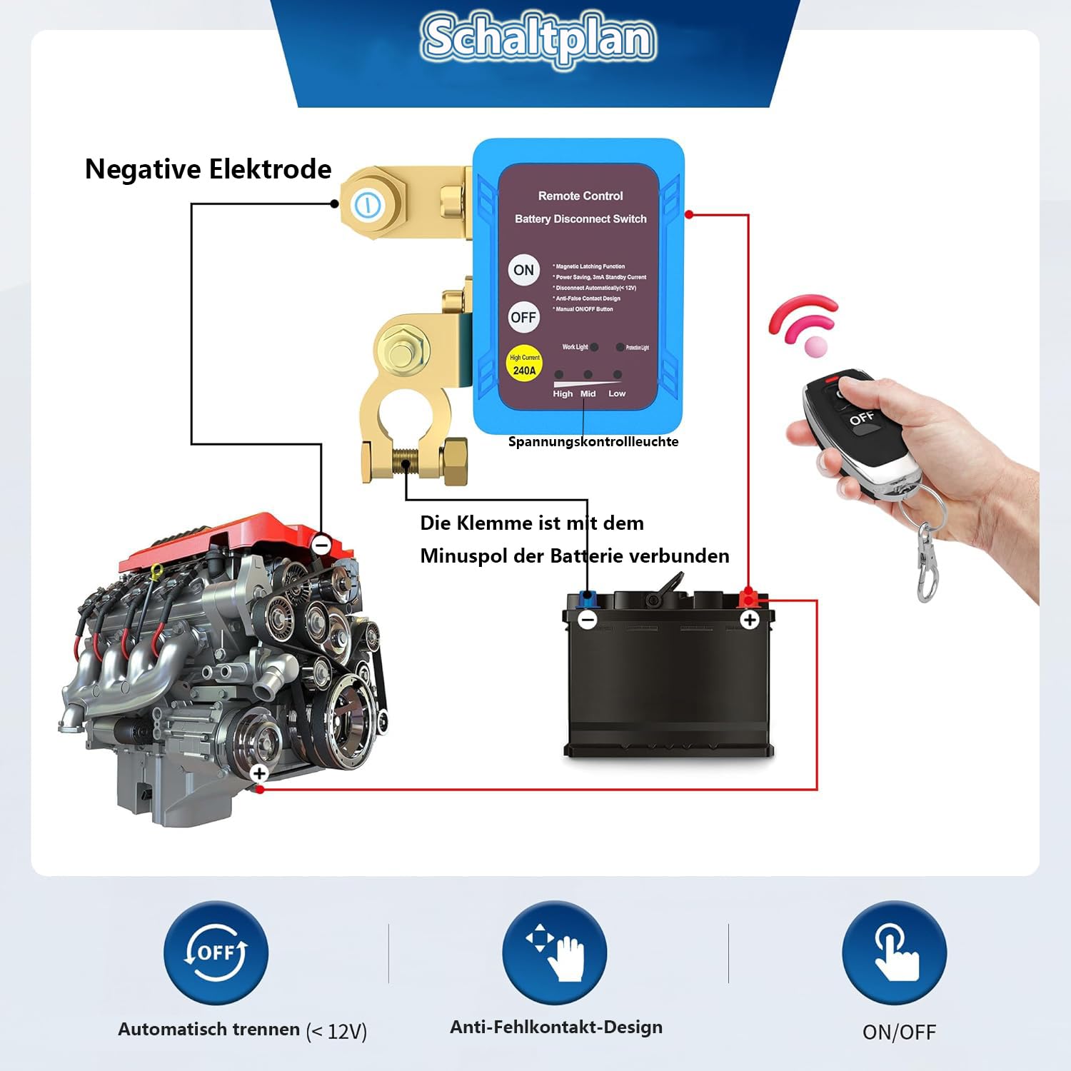 Si la tension est supérieure à 13,2 V, la télécommande est désactivée pour éviter une panne de courant accidentelle pendant la conduite et ne peut être contrôlée que via un interrupteur manuel. Interrupteur de déconnexion de batterie à distance de 9,5 mm - 12 V - Pour voiture, camion, VUTT, ATV - Anti-vol - Interrupteur d'arrêt de batterie - 200/1000 A... Faible consommation d'énergie : le coupe-batterie 12 V adopte un boîtier isolé, résistant aux hautes températures. Il peut stocker au maximum l'énergie de la batterie de la voiture, la protéger efficacement et prolonger sa durée de vie. Protection Batterie Décharge Profonde Disjoncteur De Batterie 12 V - Interrupteur De Déconnexion Sans Fil Coupe Batterie Voiture Anti-vol Automatique Protection intelligente : le coupe-batterie de voiture adopte une puce intelligente, un indicateur LED de tension amélioré, vous pouvez vérifier la tension de la batterie à tout moment, si la tension est inférieure à 11,8 V, il s'éteint automatiquement après 120 secondes, empêche la batterie de s'échapper et permet d'économiser de l'électricité. Caractéristiques et caractéristiques du produit : 1., Plage de tension de fonctionnement : 6-30 V CC., 2., Système de véhicule adaptatif 12 V et 24 V., 3., Alarme automatique du seuil défectueux et de la séparation automatique de la batterie., 4., Fréquence : 433,92 MHz, mode auto-verrouillage approprié., 5., Affichage (marche et arrêt). Fonction mémoire, le coupe-batterie adopte un double stockage magnétique, pas de consommation d'énergie après l'allumage, relais de mémoire, même s'il n'y a pas d'alimentation, le relais conserve l'état de mémoire d'origine inchangé. Négatif : 9-13 mm/15-17 mm, ne convient pas aux petits véhicules avec tête polaire. Remarque : il faut couper l'alimentation avant l'installation. Ce coupe-batterie peut empêcher la batterie de la voiture de se décharger en cas de stationnement prolongé, de câblage vieillissant et d'oublier l'arrêt des lumières. Si la tension de la batterie est inférieure à 11,8 V, l'interrupteur de la télécommande s'éteint automatiquement après 120 secondes pour économiser de l'énergie. Interrupteur de batterie de voiture, disjoncteur d... – Grandado Consommation d'énergie ultra faible de 6 700 uA., 7., Processus de conduite et protection de déclenchement des erreurs d'allumage. Large champ d'application : le coupe-batterie 12 V est adapté à la plupart des voitures, bateaux, caravanes, camping-cars, caravanes, camions, véhicules tout-terrain, UTV, motos, vélos de plage avec cylindrée inférieure à 4., 0, motos, etc. Interrupteur de déconnexion de batterie à distance à montage