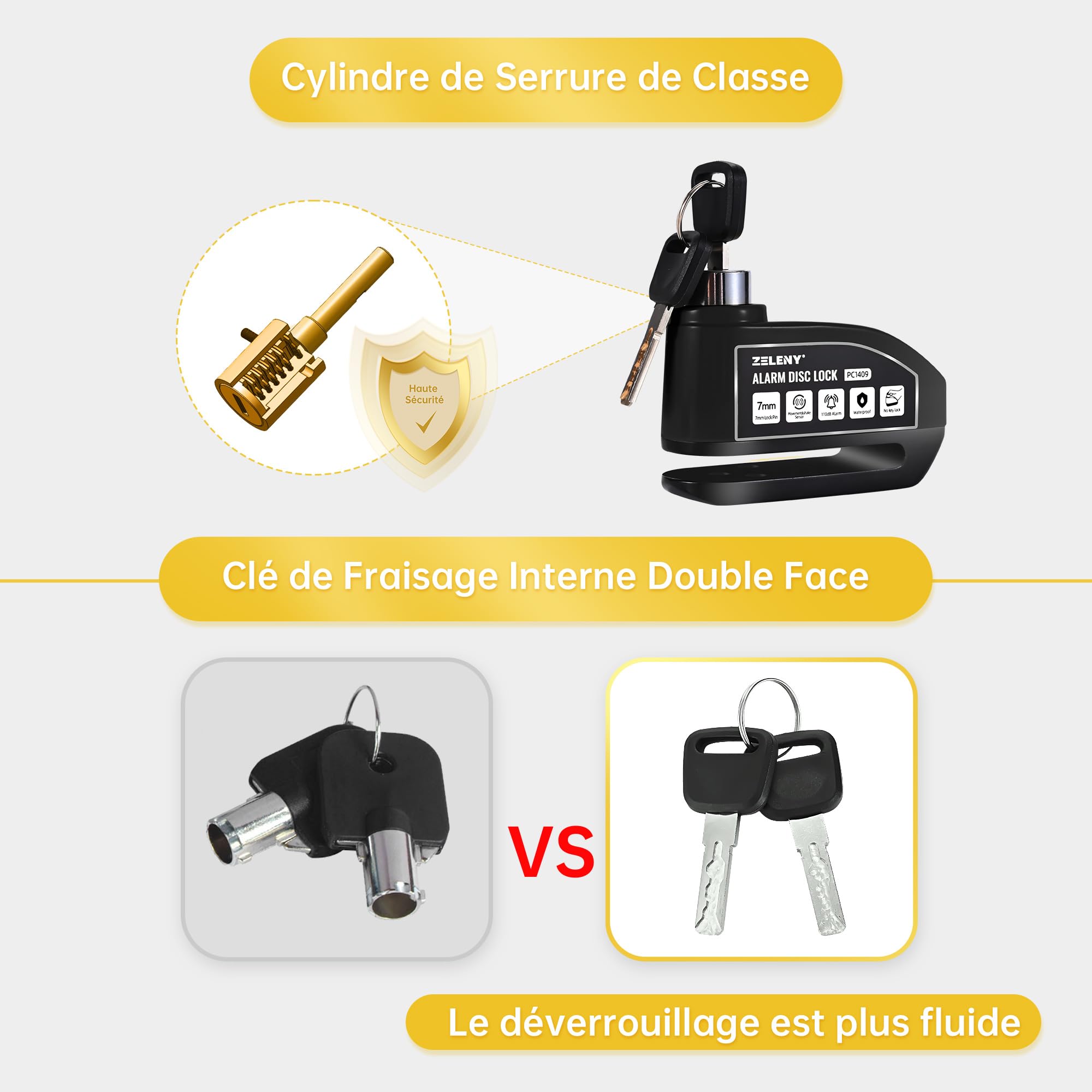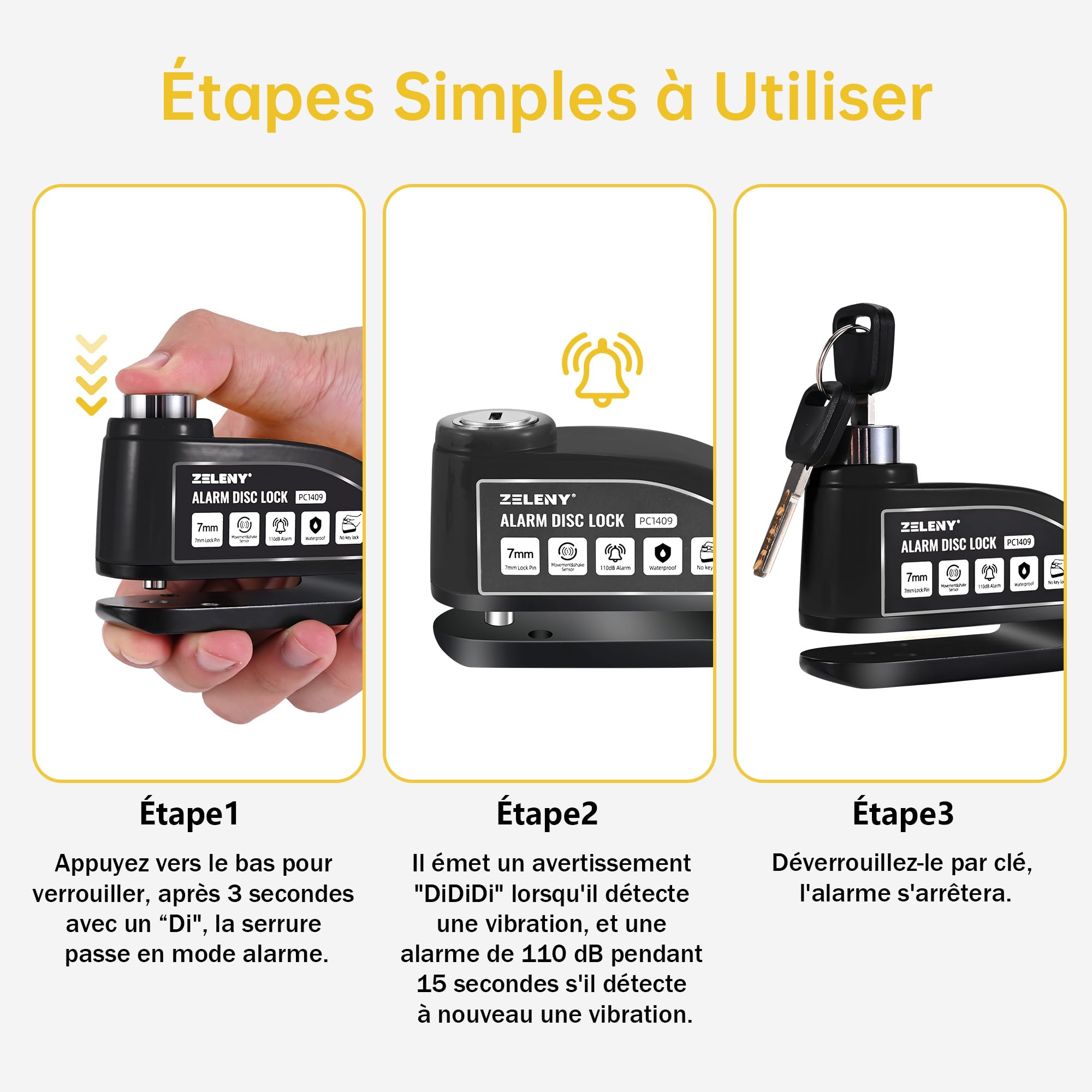 Antivol Vélo Alarme Bloc Disque ZELENY Antivol Vélo Cadenas Vélo Antivol Amélioré Chaîne Abus Antivol Velo ZELENY Antivol Moto, Bloque Disque Alarme 110db, Alarme Vélo Haute Antivol Moto, Bloc Disque Alarme 110db, Antivol de Frein à Disque avec Câble de Rappel de 1,2m... Matériau robuste et excellente étanchéité: Bloc disque ZELENY est fabriqué en acier allié et en alliage d'aluminium, Ces matériaux très résistants rendent l'antivol très solide et difficile à casser. Il est également résistant à la corrosion et ne rouille pas. Cylindre de serrure antivol avancé: Ce cadenas vélo est fabriqué à partir d'un cylindre de serrure auto-développé, qui est très solide et difficile à endommager. Haute sécurité: Cet bloque disque est doté d'une fonction d'alarme qui émet un signal sonore de haute décibels lorsque votre véhicule est secoué ou déplacé, ce qui suffit à effrayer les voleurs et à protéger votre vélo contre d'autres dommages. La clé est une clé à fente fraisée des deux côtés, qui est plus sûre qu'une clé à trou rond. Large éventail d'applications: Ce bloc disque alarme est spécialement conçu pour tous les types de véhicules à deux roues. Il convient à tous les types de bicyclettes équipées de disques de frein, aux motos, aux scooters, etc. ZEXMTE Antivol à disque de ein, rechargeable, alarme, 120 dB, avec câble de rappel de 1,8 m, renforcé, étanche, ein à disque haute sécurité pour moto, vélo, scooter, bleu