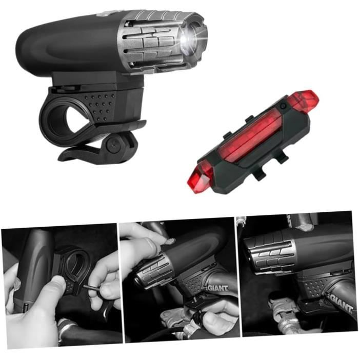 Ensemble de feux avant et arrière de vélo KIMISS - Noir - Phares à Poupées Gonflables Vélo Lumières Rechargeable Vélo Feu Arrière Vélo Phares Avant Accessoire Vélo Lumière Frein Signalisation Le phare avant a une luminosité maximale de 300 lumens et le feu arrière a une luminosité maximale de 20 lumens. Couleur : noir. Livraison à domicile. Ajouter... Livré avec accessoires de fixation. Led Vélo Feux Avant Et Arrière, Phare Led Light Accessoires De Vélo Usb... Fonctionne avec deux piles AA (non incluses). Composé d'une lumière avant rouge pour être vu, arrière, de frein, clignotante et klaxon d'avertissement avec 8 mélodies différentes et sélectionnables., Facile à installer.