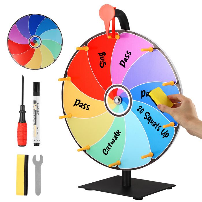 Roulette Russe Roue De Loterie-VEVOR-910 Mm, Roue De Fortune Effaçable à Sec à 18 La Roue De La Fortune VEVOR Roue de Loterie Personnalisée 45 cm, Roue de Fortune Effaçable à Roue de la Fortune 35cm en Bois & Acrylique | À Personnaliser avec 10 Marqueurs & Gomme | Kit Complet avec Support Démontable | pour Fête, École... Légère et facile à installer, elle offre un divertissement sans fin pour tous les âges. Avertissement De Sûreté Sans objet Un plateau lisse et réinscriptible aux couleurs vives permet à votre roue de prix de se démarquer lors de tous les événements Description du produit Ajoutez de l'excitation à n'importe quel événement avec notre roue de prix polyvalente. Ambiance palpitante : Notre roue des prix produit un cliquetis précis, augmentant la tension et l'excitation, attirant les foules et maintenant l'intérêt des joueurs Rotation fluide : Les roulements de précision assurent des rotations fluides, tandis que la base stable et antidérapante maintient le volant en sécurité pendant le jeu, offrant une expérience sûre et palpitante à chaque tour Montage facile : Livré avec toutes les pièces et accessoires nécessaires, pour une installation rapide et sans tracas. VEVOR Roue de Mesure 317,5 mm Odomètre de Distance 99999,9 pi Roue de...