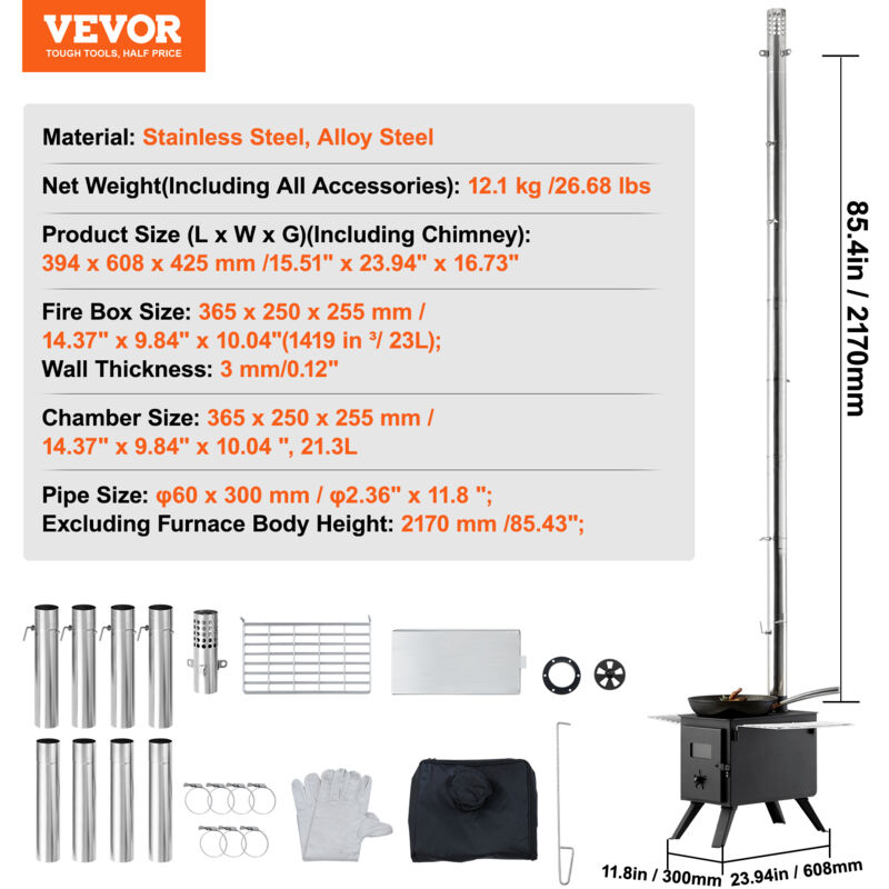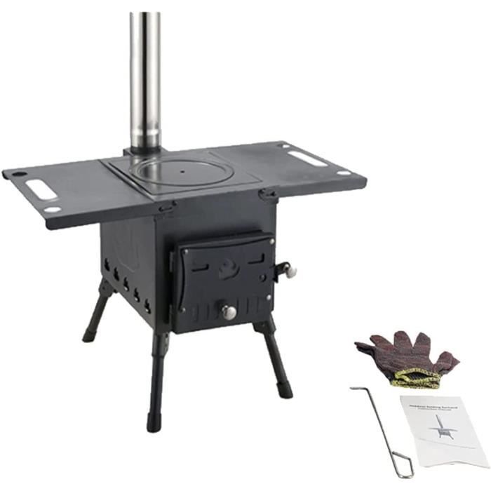 Pas besoin d'ajouter constamment du bois de chauffage. 9 accessoires inclus : pesant seulement 54 lb, l’ensemble du poêle et des accessoires est léger. 3 caractéristiques de sécurité : le revêtement en poudre à 550 degrés élimine les odeurs pendant le chauffage et la cuisson. Foyer de 3 000 po³ : faites l'expérience d'un chauffage rapide et durable avec notre foyer de grande capacité. Poêle à bois portable pour tente de camping en 2024 : Avis + Guide - Blog Le cendrier intégré assure un nettoyage sans effort. Poids net (y compris tous les accessoires) : 24,5 kg /54 lbsTaille du produit (cheminée incluse) : 590 x 790 x 2620 mm /23,23 x 31,1 x 103,15Taille de la chambre : 550 x 330 x 295 mm /21,7 x 13 x 11,6, 49,2 LTaille du tuyau de fumée : NO 1 : φ 127, NO 2 : φ 125, NO 3 : φ 120, NO 4 : φ 115Taille du tuyau d'échappement : φ 127 mm ; Épaisseur de paroi : 0,6 mmHors hauteur du four : 1 910 mm /75,20Taille de la chambre de combustion : 550 x 330 x 295 mm, 3267in ³Épaisseur de paroi : 1,5 à 3 mmContenu du Colis16 boulons à douille hexagonale M6 x 15., 3 boulons demi-ronds M5 x 10., 3 x écrous M54 x pieds de support1 x socle de cheminée1 x régulateur de fumée4 x cheminées1 x couvercle de cheminée2 x réseaux de périphérie1 x pelle1 x grattoir1 x Gants1 x mode d'emploi Vous aimez profiter du grand air, mais le froid vous dissuade parfois de passer la nuit sous les étoiles ? Le produit « VEVOR Poêle à bois » est la solution idéale pour vous. Ce poêle portable en acier inoxydable, doté de huit tuyaux de cheminée et de gants, vous offre une chaleur réconfortante dans votre tente. Conçu pour le camping, il facilite la cuisine et le chauffage... La grille de feu inférieure empêche la surchauffe et les risques d'incendie potentiels. SpécificationsNuméro de modèle de l'article : VOLD-002A. Les panneaux de 3 mm / 0,12 d'épaisseur empêchent la déformation même lors du transport d'objets lourds, garantissant ainsi durabilité et longévité. Poêle Tente Portable Acier VEVOR Poêle à Bois, 86 Pouces, Poêle De Tente De Camping En Acier Poêle A Petrole VEVOR Poêle de camping pour tente VEVOR, poêle à bois de tente, poêle à... Le pare-étincelles empêche les étincelles de voler.