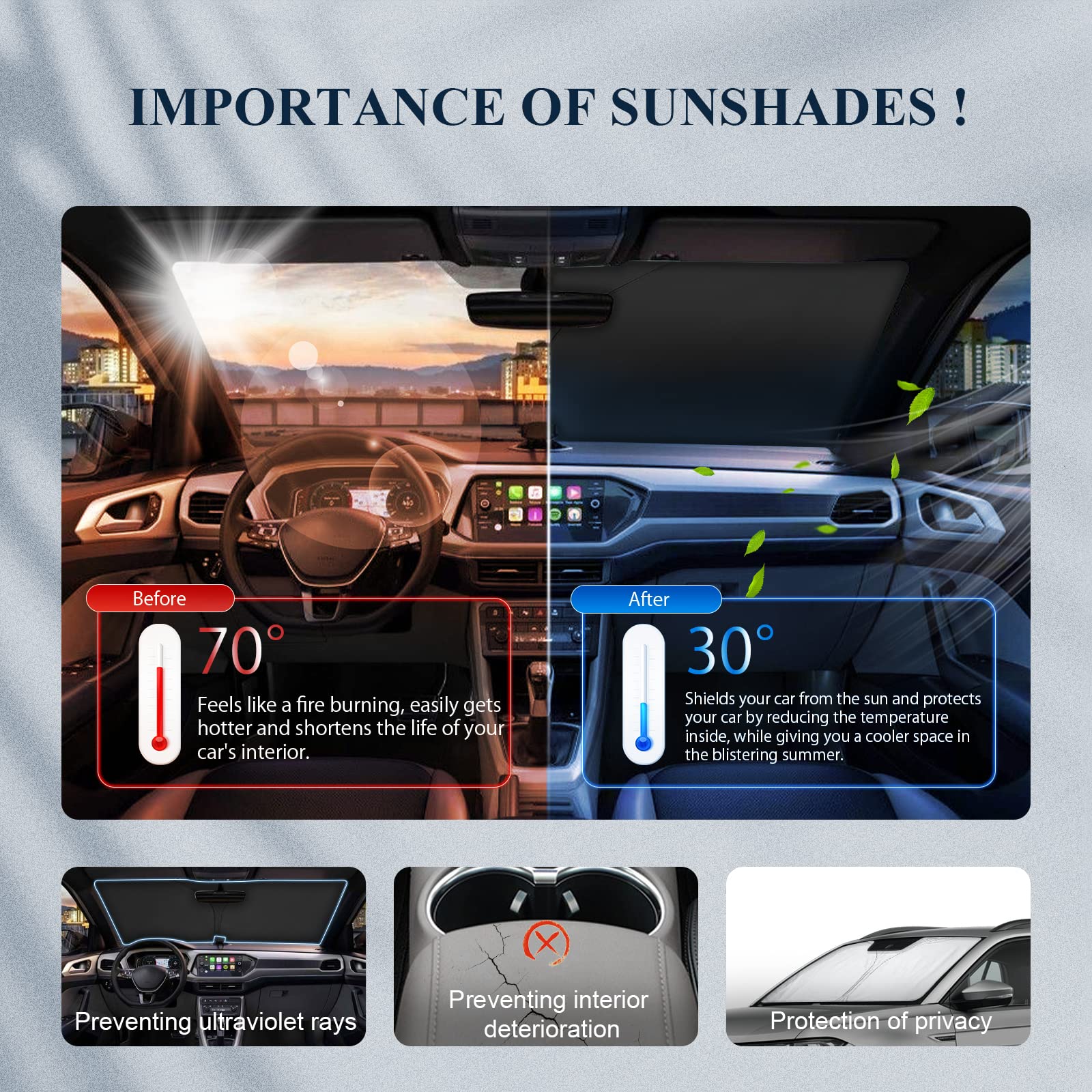 Cette housse de protection contre le gel a été conçue avec une structure composite à quatre couches pour protéger votre véhicule de manière optimale en hiver et en été. Maintien sûr en cas de vent et d'intempéries. La pluie et la neige perlent facilement – pas de gel, pas de pénétration. Au printemps et en automne : protège de la poussière, du pollen, des feuilles et de la pluie. Le montage ne prend que quelques secondes – sans outils. Avec rabats de porte et bandes de fixation élastiques, la housse reste stable sur la vitre : Les battants de porte se coincent entre la porte et la carrosserie – empêche le vent ou le vol. Housse Pare Brise Vw T Cross Housse De Pare-brise Pour VW T-Cross - Housse De Protection 4 Couches Peva Coton Housse De Pare-Brise Avant Compatible Avec Vw T4, Luxe Pare-Soleil De Idéal pour les nuits froides – pas de pare-brise gelé le matin. En été : réfléchit les rayons du soleil et réduit la température intérieure. Protection toute l'année : protège efficacement votre pare-brise de la neige, des pneus, de la glace, des rayons UV et de la poussière. Protégez les vitres latérales de votre véhicule du gel, de la glace, de la neige, des feuilles et de l'eau. Coupe-vent et anti-rayures : La housse de pare-brise est dotée de quatre cordons en caoutchouc épais avec des crochets en plastique aux deux extrémités, empêchant le pare-brise de s'envoler Isolation épaisse et protection contre le gel : La couche intérieure en coton assure une isolation thermique efficace. Isolation en coton épais : équipé d'une couche de coton d'isolation thermique supplémentaire, il empêche efficacement la formation de gel et garde le froid à l'extérieur. Cette housse de pare-brise de voiture est compatible avec Volkswagen T Cross 2018, 2019, 2020, 2021, 2022, 2023, 2024, 2025, 2026 La housse antigel peut être pliée pour le rangement et facile à transporter Utilisable toute l'année : la housse de pare-brise d'hiver protège le disque de la glace et de la neige en hiver et bloque les UV et le chauffage solaire en été. Dans la vie quotidienne, également comme protection contre la saleté et la poussière Couche extérieure imperméable en PEVA améliorée : fabriquée en film PEVA de haute qualité, cette housse offre une excellente résistance à l'eau et anti-pénétration. Montage rapide et sûr : grâce aux rabats de porte et aux bandes élastiques, la housse reste fermement en place, même en cas de vent fort. Matériau PEVA respectueux de l'environnement, flexible, résistant à la déchirure.
