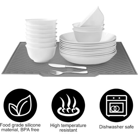 Tapis Vaisselle , Tapis De Séchage Vaisselle, Tapis Égouttoir Tapis Egouttoir Vaisselle Cet égouttoir multifonctionnel est un accessoire indispensable dans votre cuisine. Tapis égouttoir à vaisselle – 40 x 33 cm en silicone pour comptoir de cuisine | Tapis sec de cuisine résistant à la chaleur | Gadget de cuisine... Séchage rapide : le Xiruiubao tapis égouttoir en silicone présente une structure unique avec de larges bandes en relief qui améliorent efficacement la circulation de l'air et augmentent considérablement l'efficacité de l'égouttage de la vaisselle, de sorte que votre vaisselle sèche plus rapidement et qu'il ne reste aucun résidu d'eau. Égouttage efficace : la surface ondulée de ce tapis égouttoir s'adapte à la forme de la vaisselle et, combinée au trou d'évacuation, évacue rapidement l'eau accumulée. La conception inclinée accélère encore l'égouttage, empêche l'accumulation d'eau et maintient le plan de travail sec et propre. C'est l'alternative idéale aux égouttoirs encombrants. Antidérapant et résistant à la chaleur : le dessous de ce tapis sechage vaisselle étanche est doté de picots antidérapants qui assurent une bonne stabilité. Il peut entrer en contact direct avec la vaisselle, est sûr et fiable, ne se déforme pas même après une utilisation prolongée et est facile à nettoyer. Polyvalent : ce egouttoir vaisselle en silicone est multifonctionnel et peut être utilisé non seulement comme égouttoir à vaisselle, mais aussi comme support résistant à la chaleur, support pour machines à café, support de cuisson ou support antidérapant pour planches à découper. Tapis égouttoir à vaisselle en silicone Brabantia SinkSide