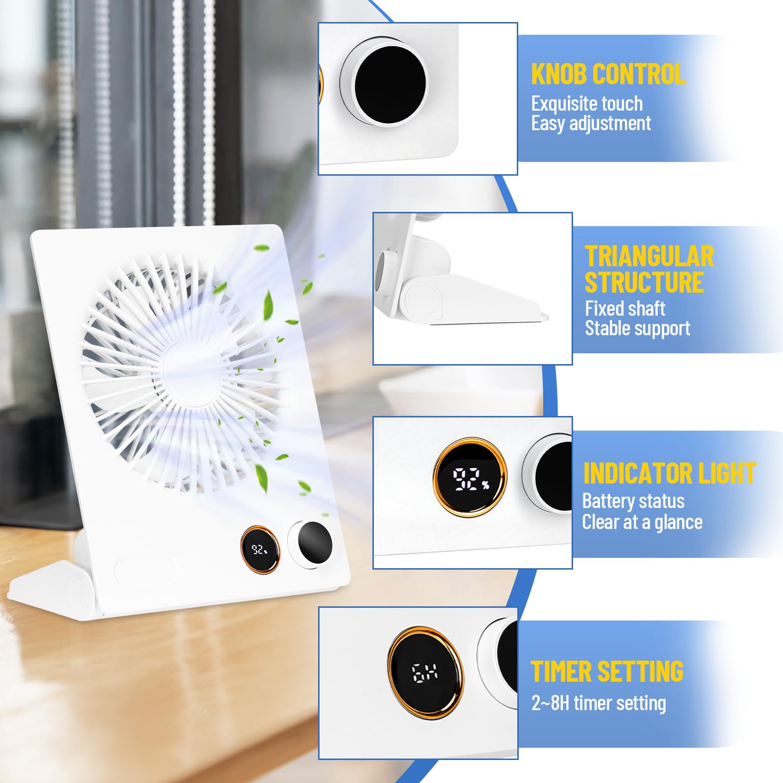 【Batterie rechargeable et ventilateur USB】Ce ventilateur rechargeable est équipé d'une batterie intégrée de 5000 mAh offrant une autonomie allant de 3 à 11 heures. Ventilateur portable, ventilateur portable, ventilateur personnel rechargeable 4000 mAh, mini ventilateur de bureau pliable à 180° - Bricolage Idéal pour modifier les réglages au lit ou sur le canapé. Mini Ventilateur Usb Mini Ventilateur Bureau, Ventilateur USB Rechargeable à 4000 Mah Ventilateur Rechargeable Vous serez toujours au frais et à l'aise ; il vous suffit d'ajuster l'angle et de profiter d'une fraîcheur optimale grâce à ce ventilateur puissant et silencieux. 【Vitesse variable et flux d'air puissant】Commande par simple pression sur l'interrupteur, la vitesse du vent et la minuterie. Ventilateur de table silencieux, rechargeable par USB, avec batterie de... Avec ses dimensions de 145 x 40 x 180 mm et son poids de 272 grammes, il se glisse facilement dans un sac à dos ou une valise. Le puissant moteur sans balais génère un vent puissant et sa vitesse maximale atteint 4000 tr/min et 4,65 m/s, vous permettant de vous rafraîchir pendant les fortes chaleurs de l'été. Ventilateur inclinable à 180°, pliable et suspendu]Ce ventilateur de table est équipé d'un support rotatif à 180°, permettant d'ajuster l'angle selon vos... Cliquez sur le bouton pour activer la minuterie, qui peut être réglée de 2 à 8 heures. Appuyez sur l'interrupteur pendant 2 secondes pour démarrer le ventilateur. L'écran LED intelligent vous permet de consulter la puissance restante, la vitesse du vent et la minuterie en temps réel. Il peut être utilisé comme ventilateur de table ou suspendu, quel que soit l'angle. 【Silencieux et compact】Grâce à son moteur sans balais de haute qualité et à sa technologie innovante, ce mini ventilateur de table atteint une vitesse de vent allant jusqu'à 4000 tr/min.