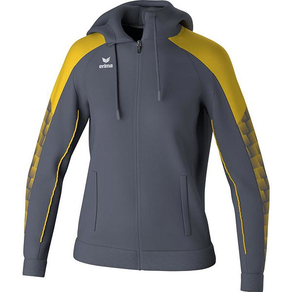 Veste à capuche d'entraînement femme Erima Six Wings - new roy/jaune Matière Fonctionnelle Résistante Sport Veste De Survêtement Avec Capuche Femme Erima Evo Star - Vêtements Veste Sport Confort Décontracté La veste d'entraînement Erima EVO STAR pour femmes est dotée de poches zippées pratiques sur le côté, dans lesquelles tu peux ranger tes essentiels en toute sécurité. La capuche te protège du vent et des intempéries pour que tu puisses te concentrer pleinement sur ton match ou ton entraînement Veste à capuche résistante et extrêmement confortable. La veste d'entraînement présente un design élégant avec un effet tridimensionnel sur les manches et des liserés contrastants. Sa coupe ajustée offre une... Larges bords-côtes sur les manches et bas de veste Matière fonctionnelle résistante