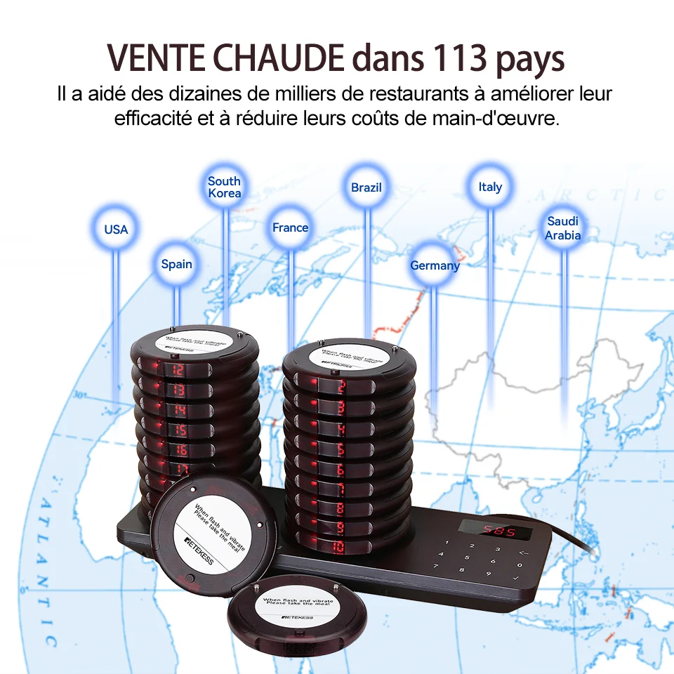 Largement utilisé dans les restaurants, hôtels, hôpitaux, églises et cafés. Lorsqu'il est remis au client, il peut encore fonctionner pendant longtemps. Le mode sonnerie peut être modifié au besoin. 1 Bip sonore + flash + secousse; 2 Bips + flash; 3 Flash + secousse; 4 Bip + secousse; 5 Bips; 6 Flash; 7 Secouer Système Appel Sans Fil 20 Bipeurs Restaurant Biper Vibreur, 20 Bipers, 1000 M Système D'appel Sans Système Pager KZH 7 Modes Sonnerie 20 heures de temps d'utilisation. La conception globale est belle et la finition est très délicate. Le couvercle en plastique transparent est beaucoup plus solide que le couvercle en plastique normal. Les autocollants en papier peuvent être placés derrière afin que les clients ne le grattent pas comme un Pager normal. SU-680 Système d'Appel sans Fil, 30 Bipeur Restaurant Longue Portée 999 Il est également possible d'économiser de la main - d'œuvre dans les restaurants. Les clients n'ont plus besoin de se blottir dans le restaurant. [longue durée de vie de la batterie] - chaque Pager sans fil est intégré avec une batterie rechargeable de 3,7v 300mah. [7 modes promotionnels] - Shake + Flash + Buzz, Shake + Flash, Flash + Buzz, Shake + Buzz, juste shake, juste Buzz, juste flash. Bipeur longue portée avec alerte lumineuse et vibration – Parfait pour les grandes surfaces et les établissements de restauration rapide. Bipeurs personnalisables avec logo et instructions – Un excellent moyen d’ajouter une touche professionnelle à votre service VEVOR Bipeur Client, 20 H Système de Radiomessagerie, 98 Canaux Système... La combinaison de vibrations et de paillettes est parfaite pour répondre à tous vos besoins. Les clients n'ont pas à faire la queue pour attendre, maintenir une distance sociale et être plus productifs. [excellente performance] - le système de Pager de restaurant se compose d'un émetteur de clavier tactile sans fil 998 canaux et de 20 pagers. Lorsque vous appuyez sur le clavier, il émet un bip et tremble. Il y a une zone d'affichage de logo à l'avant où vous pouvez placer l'image de votre magasin, le nom ou d'autres publicités. Pager avec bouton d'arrêt Appuyez sur le bouton Power-off et appuyez sur Call pour éteindre tous les pagers de charge.