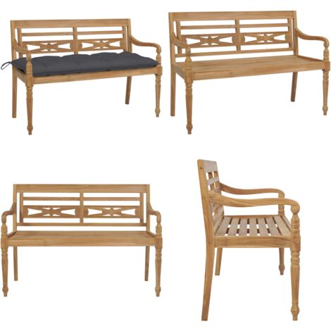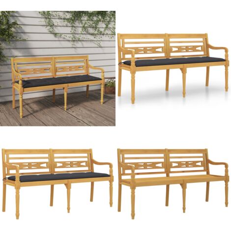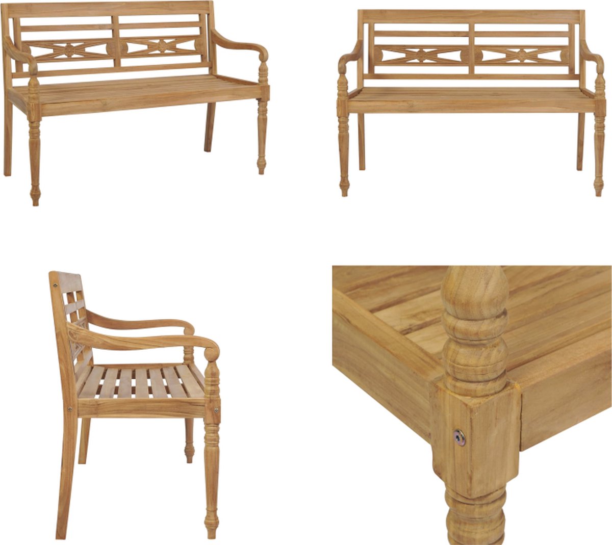L'assemblage est facile. Banc Batavia avec coussin crème 150 cm Bois de teck massif... Dimensions : 120 x 51,5 x 84 cm (l x P x H) Grâce à sa surface finement poncée, cette banquette 2 places est résistante aux intempéries et facile à nettoyer. Banc 2 Places Extérieur VidaXL Teck Banc Batavia Avec 2 Places Banquette Mobilier Meuble De Jardin Banc Terrasse Résistant Intempéries Matériau : bois dur de teck finement poncé avec finition Fabriquée en bois dur de teck extrêmement durable, cette pièce de meuble en teck a été chevronnée, séchée au four puis finement poncée pour lui donner un aspect très lisse. Couleur : marron/Blanc/Gris foncé/Marron clair Profondeur du siège : 51,5 cm Fabriquée en bois dur de teck extrêmement durable, cette pièce de meuble en teck a été chevronnée, séchée au four puis finement poncée pour lui donner un aspect très lisse Le bois de teck est le choix idéal si vous souhaitez acheter un meuble de jardin durable. Il ajoutera une touche de charme rustique à votre jardin et est parfait pour vous détendre en plein air avec vos amis ou votre famille. Ce banc Batavia est confortable et élégant et donnera une apparence simplement étonnante à votre jardin ou patio. Fabriquée en bois dur de teck extrêmement... Le bois de teck est connu pour sa résistance exceptionnelle aux intempéries, ce qui le rend bien plus adapté aux meubles de jardin que tout autre type de bois. Le banc a subi une finition à l'huile pour faire ressortir la couleur chaude du bois Banc Batavia 120 cm Teck vidaXL 43052 - Gamm vert