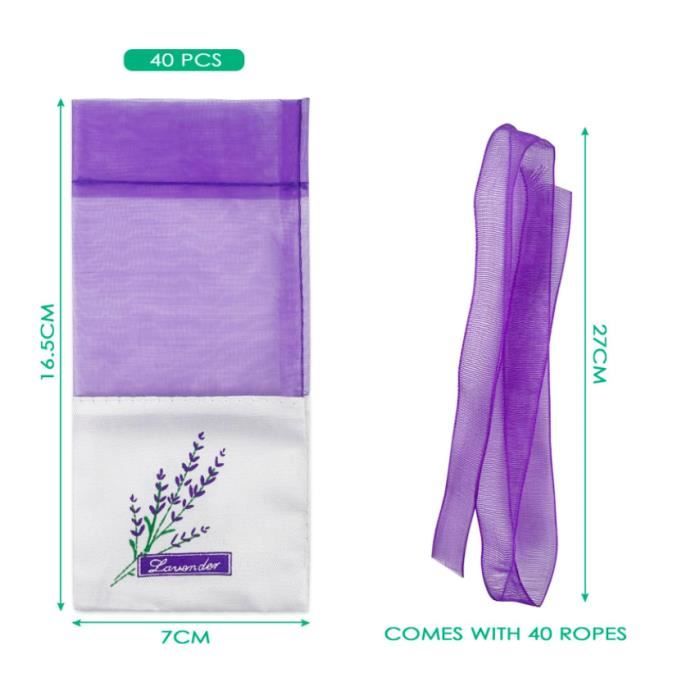 Sachets Lavande 40 Pièces Sachet Lavande Vide, Avec 40 Rubans De Fils Cordon De Serrage, Sachet Tissu Parfumé Armoire Anti Mite, Sachet(Sac Vide) - Electroménager Sacs Herbes épices Armoire 40 Pièces Sachet Lavande Vide avec 40 Rubans de Fils Cordon Sollbry Sachets de Lavande Parfumée - 20 Sacs en Coton-Ramie avec... L'ouverture à cordon facilite le remplissage avec des fleurs décoratives ou d'autres matériaux parfumés tout en garantissant une fermeture hermétique, alliant beauté et rétention efficace du parfum. Idéal pour rafraîchir les vêtements et leur conférer un parfum naturel, il peut également servir de sachet pour la maison afin d'améliorer la qualité de l'air intérieur, ou être associé à de la lavande pour un bain relaxant qui détend le corps et l'esprit. Matériaux de qualité supérieure, durables et respirants : fabriqué à partir d'une maille respirante et d'un tissu robuste. COYUN Lot de 40 Pièces Sachets Lavande Vide, Cordon de Serrage en Gaze et Coton, Sachets en Organza, Sacs Vides en Coton, Tissu pour Épices, Herbes et Armoires, Lavande Séchée La maille diffuse efficacement le parfum tandis que le tissu garantit la longévité du produit, permettant une utilisation répétée pour répondre aux besoins à long terme en matière d'aromathérapie. Création personnalisée, créativité sans limite : sous forme de pochette vide, elle peut être remplie de lavande séchée, d'autres herbes ou de granulés parfumés selon vos préférences personnelles, vous permettant de créer un sachet parfumé sur mesure. Que ce soit pour un usage personnel ou comme cadeau, elle transmet un sentiment unique. Sachets en gaze de lavande, 24 pièces, sachets de ... – Grandado