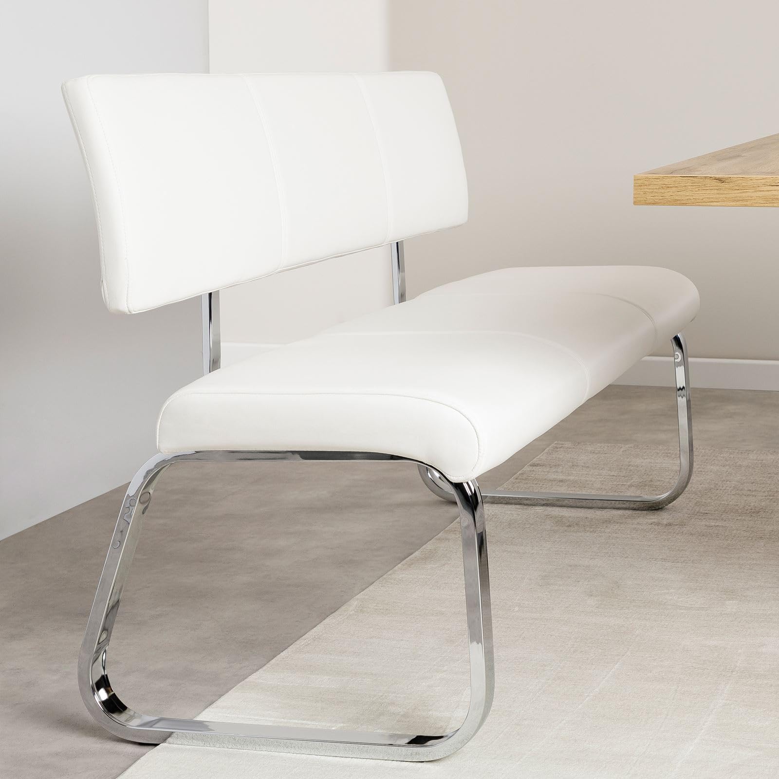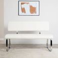 Banc design avec dossier VILAS, en tissu gris foncé et piètement en Banquette Entrée Blanc Tissu IDIMEX Banc Design Vilas Siège Avec 3 Places, Banquette Au Piètement Dimensions 136x87x56 Cm Confortable Cette banquette est une solution idéale pour installer des places assises, là où l'espace est trop réduit pour des chaises. Grâce à son rembourrage et à la présence d'un dossier, ce banc vous assure un confort optimal Le piètement de ce banc est en métal chromé, l'assise et le dossier sont rembourrés et recouvert d'un revêtement en tissu de coloris blanc crème Profondeur assise: 44 cm - Matériau du piètement: Métal - Nombre de places: 3 - Revêtement assise: 100% Polyester - Revêtement dossier: 100% Polyester... Avec son design élégant et moderne, ce banc trouvera facilement sa place dans votre intérieur où que vous le placiez Cette banquette est idéale pour aménager un espace réduit, où vous n'avez pas assez de place pour des chaises classiques