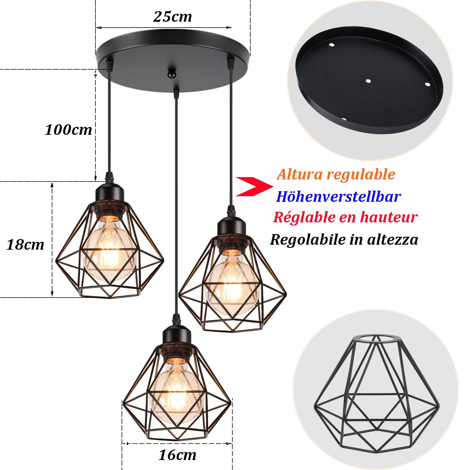 PETITES ECREVISSES Lnaire Plafonnier LED Industriel E27 Lustre Suspension Design Moderne avec 5... 【Support de lampe compatible E27】(Livré sans ampoule) Un ensemble d'un plafonnier industriel avec un design de cage en métal, adapté à toutes les douilles E27, telles que les ampoules LED, les ampoules halogènes, les ampoules Edison, les ampoules incandescentes, etc. 【Accessoires d'installation inclus】Le paquet comprend un plafonnier en bois, qui peut être installé rapidement et facilement avec les pièces détachées incluses, pas besoin d'acheter des matériaux supplémentaires, rapide et facile à installer. Abat-jour Cage Métal 16cm 3 Lampes Suspension Industrielle Vintage Métal Lustre Suspension Style Cage Geometrique E27 Lampe Suspension Vintage Noir 86808936 Suspension Bois Et Métal E27 Base en bois avec cage en fer, différentes façons assorties pour ajouter un effet décoratif différent à votre pièce. Lustre vintage industriel, design rétro simple, idéal pour la plupart des intérieurs modernes. Cette élégante suspension est parfaite pour tous les styles d'intérieur, y compris contemporains, vintage, ferme et loft 【Taille de la lampe】La taille du lustre est la suivante : taille de l'abat-jour : 16*16 cm, hauteur de la douille en bois : 5,5 cm ; taille de la base en bois : 12*2 cm. STOEX Suspension Luminaire Industrielle Contemporain, Lustre Abat-Jour