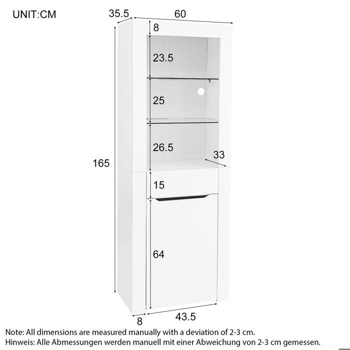 Design élégant : Die schlanke Silhouette (178x50x35cm) macht die Vitrine zum perfekten Eyecatcher. erax Vitrine avec luières LED - Vitrine en verre avec beaucoup d... Le tiroir inférieur (capacité de charge de 30 kg) offre un espace de rangement caché supplémentaire, pratique et bien rangé à la fois. Le tiroir pratique dans la partie inférieure offre un espace de rangement supplémentaire avec une capacité de charge de 30 kg. Blanc Bois Naturel Tiroir Rangement Vitrine LED Moderne Avec Port USB, Vitrine En Verre Avec 2 Tiroirs Et étagères Réglables, MDF Bibliotheque Vitrine Éclairage LED avec 16 couleurs et port USB : équipé d'un système LED moderne avec alimentation USB et 16 nuances au choix, facilement contrôlable par télécommande. Description du produit Cette élégante vitrine sur pied combine un design moderne et une fonctionnalité pratique. La combinaison du blanc et du décor en bois naturel s'intègre harmonieusement dans n'importe quelle pièce. Sa forme élégante et fine en fait un accroche-regard élégant dans le salon, le bureau, la salle à manger ou le couloir. Livraison facile et qualité durable : la livraison se fait en deux paquets pratiques pour une livraison sûre. La surface mate en MDF et panneaux de particules est complétée par le décor de couleur bois naturel sur l'extrémité supérieure. Les dimensions compactes de 50 x 35 cm font de cette vitrine un meuble peu encombrant mais impressionnant. MERAX Vitrine moderne avec éclairage LED - 150Hx78Wx40Dcm - Porte en... Avec une hauteur de 178 cm, il offre un espace d'exposition généreux sur cinq niveaux, chaque étagère pouvant supporter jusqu'à 20 kg. Construction robuste avec verre de sécurité trempé, pieds antidérapants et instructions de montage claires (français non garanti) pour une utilisation sûre et durable. Merax Vitrine mit LED-Beleuchtung und offenen Fächern Buffet