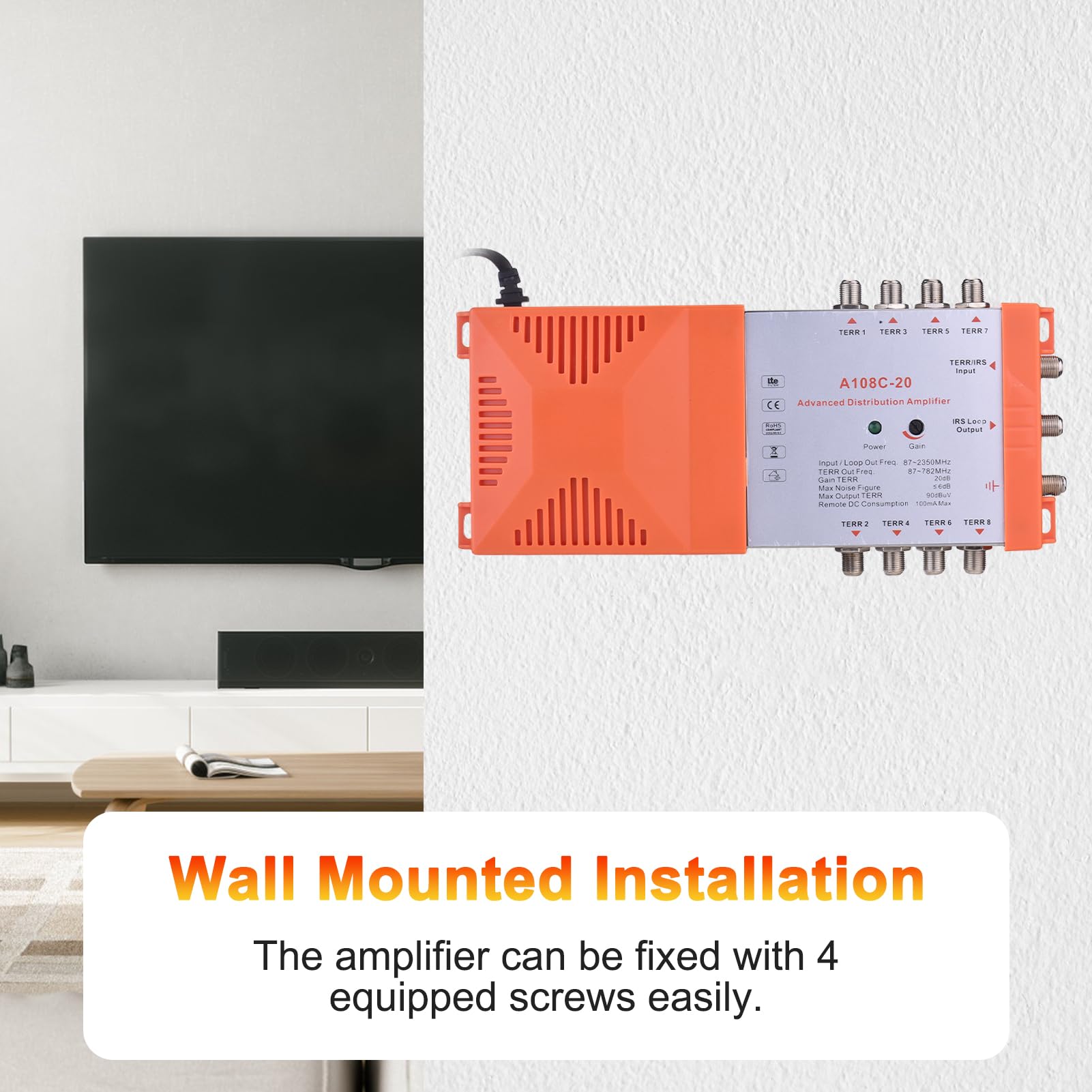 Fonction de boucle IRS : grâce à la fonction de boucle IRS, il peut être connecté directement aux sorties utilisateur multi-commutateurs, offrant ainsi des possibilités de connexion polyvalentes pour votre système MATV. Indicateur d'alimentation : LED. Amplificateur Signal TV Radio Terrestre Amplificateur Distribution TV 8 Voies Weytoll - Terrestre Et Système MATV Avec Boucle IRS EN STOCK : Amplificateur de distribution professionnel 8 voies avec amplificateur de distribution TV et radio terrestre en boucle Amplificateur de signal d... 1 manuel d'utilisation (français non garanti). SpécificationsAmplificateur de distribution à 8 canaux. Consommation de courant à distance : max., 100 mA. Que vous installiez un réseau de distribution multi-télévision dans un appartement, un hôtel ou un bureau, cet amplificateur est la solution parfaite. Gain élevé et faible bruit : ce répartiteur 8 voies offre un gain de 20 dB et est adapté pour amplifier les signaux TV et radio terrestres faibles (87-782 MHz) pour assurer une sortie forte et stable sur les 8 ports. Certification : rouge classe 3 Gain : TERR : 20 dB. Large gamme de fréquences et filtre 4G : prend en charge une large gamme de fréquences TERR de 87 à 782 MHz et dispose d'un filtre 4G à haute suppression qui garantit la compatibilité avec la plupart des niveaux de signal et environnements. Alimentation à distance (via la sortie TERR) : 12 V CC. Cet amplificateur de distribution permet de brancher jusqu'à 8 téléviseurs sur la même antenne TV HD tout en préservant la qualité et la puissance du signal Grâce à son facteur de bruit extrêmement faible ≤ 6 dB, il minimise la dégradation du signal pour des images plus nettes et un son plus clair. Deux options d'alimentation : l'amplificateur de distribution à 8 canaux peut être alimenté à distance via le câble d'alimentation fourni ou, s'il n'y a pas de prise secteur, via l'une des sorties TERR avec un bloc d'alimentation approprié (non inclus). Perte de boucle satellite : 4 dB., Impédance : 75 Ω. CABLEPELADO Mélangeur de signaux satellites et terrestres | Mélangeur