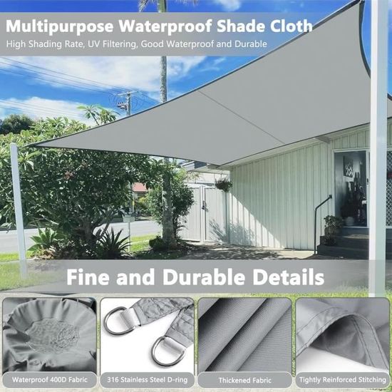 Utilisation idéale: Les toile ombrage exterieur offrent intimité, sécurité et fraîcheur, largement utilisé dans les patios, pelouses, jardins, piscines, étangs, terrasses, arrière-cours, parcs, abris de voiture, pergola, allées et autres lieux extérieurs. Largement utilisé pour le jardin, les patios, la cour, l'arrière-cour, cour, porche, espace barbecue, allée, entrée, pelouse, ombrage végétal, terrasse, parc, piscine, abri voiture, bateau, camping, étang, ou d'autres occasions en plein air. Voile Imperméable Patio Jardin Voile D'ombrage Imperméable Triangulaire 3x3x4,25m Protection Rayons UV Pour Exterieur Terrasse Patio Jardin Sable 87669193 Toile Ombrage Patio Jardin 95% UV Voile D'Ombrage Imperméable Rectangulaire 4X6M, Toile Ombrage Pes... Le paquet contient: 1*Voile d'Ombrage Remarque: Afin de ne pas nuire à la durée de vie de la toile d'ombrage, il est recommandé de la retirer par mauvais temps. Peut réduire considérablement la température et créer un espace extérieur frais et confortable. Idéal pour terrasse, balcon, jardin, piscine, camping, pelouse, parking ou d'autres espaces extérieurs. Veuillez choisir la taille et la couleur appropriées en fonction de la taille de votre scène. Protection solaire en tissu imperméable, Indice d'ombrage de 95 % et protection contre 95 % des rayons UV nocifs, créer un espace plus confortable. Il est important que la voile d'ombrage ait une pente, que l'angle d'installation soit de 20 à 40 degrés et que la tension soit la plus grande. Description de la taille: Erreur +/-3cm due à la couture artificielle. Nous vous conseillons que l'angle d'installation de 20 à 40 degrés sert bien à obtenir une tension maximale pour voile d'ombrage. Voile d'Ombrage - A269 - Rectangulaire Triangulaire - Imperméable... Retendez régulièrement pour une surface lisse. Bords incurvés sur tout le pourtour de l'auvent, la zone ombrée est plus petite que la taille indiquée. Tous les bords de la Voiles Ombrages sont finis avec des coutures renforcées à double couche durables pour éviter les bords effilochés et la déformation. Voile d'ombrage DKLE 4x4x5.7m Triangle Rectangle Imperméable Anti-UV