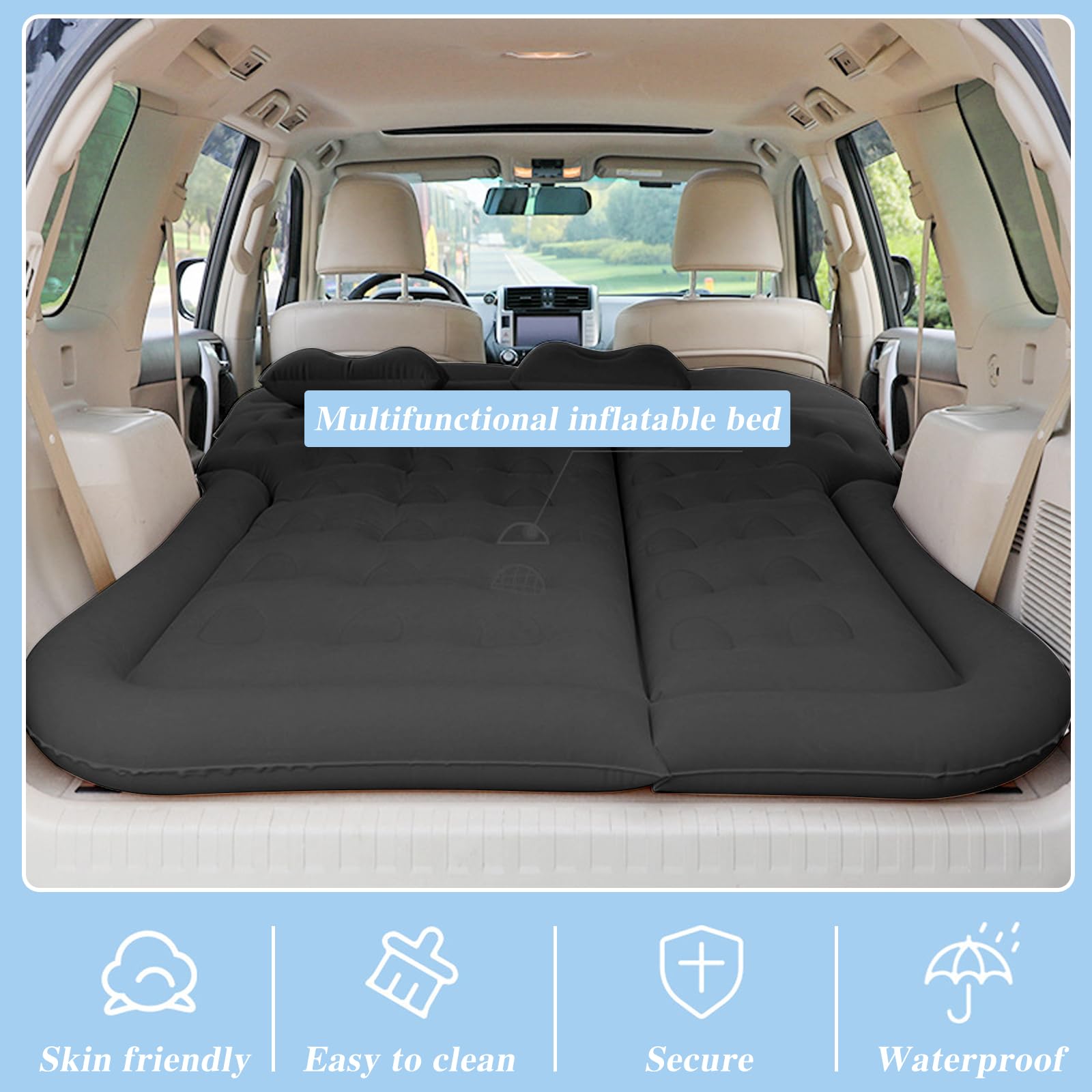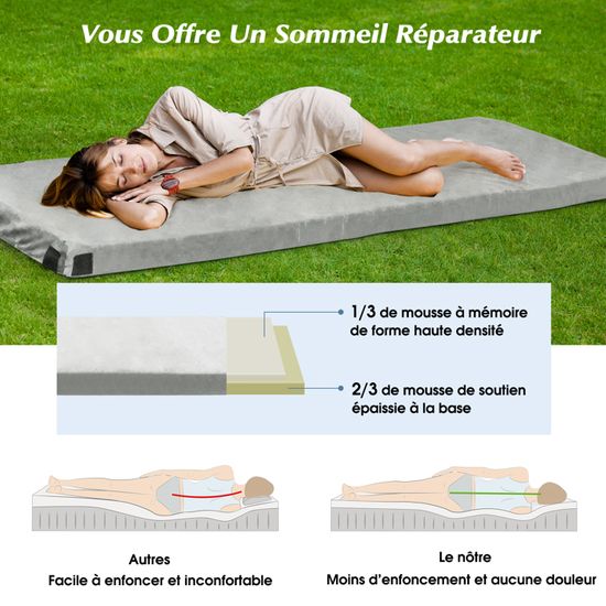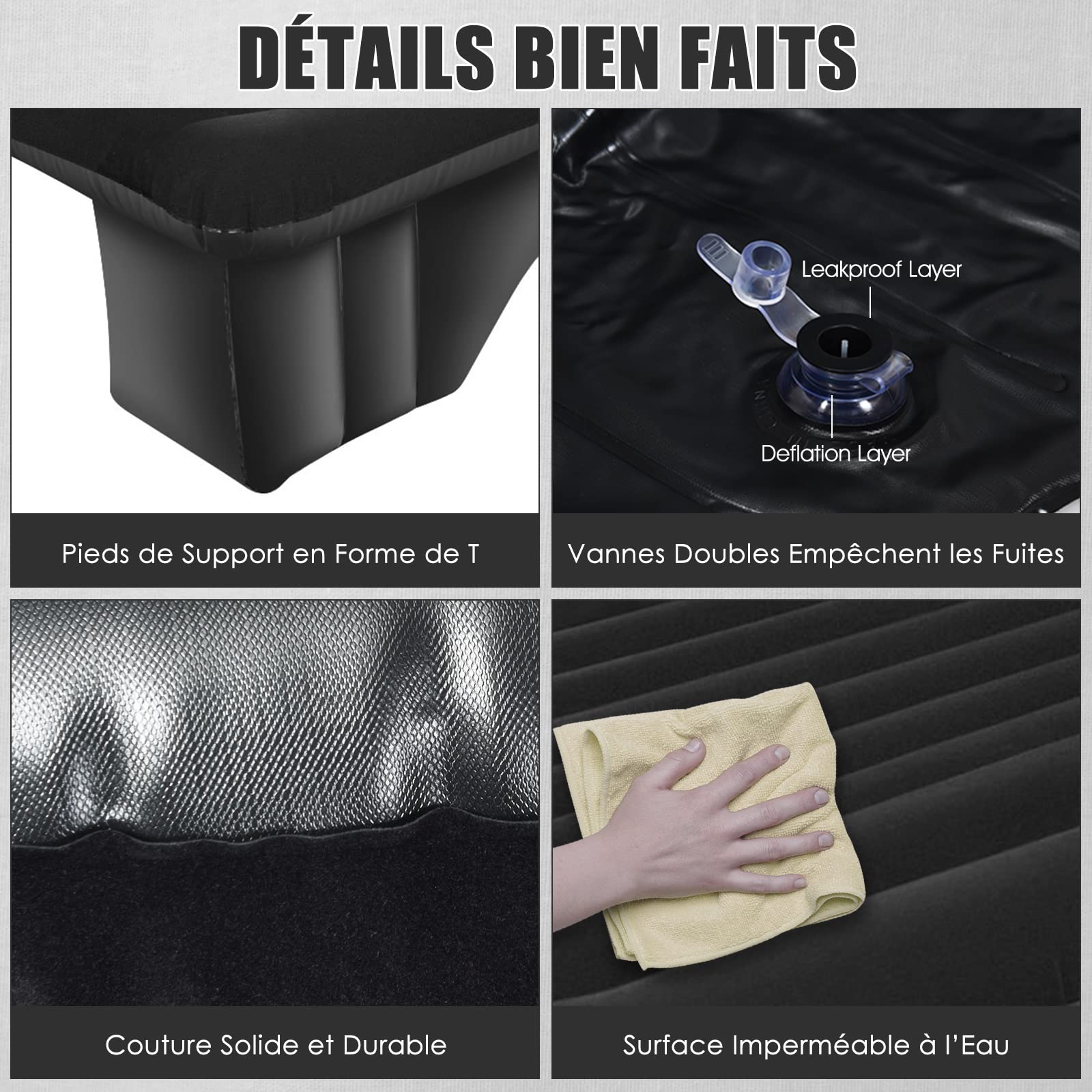 Adaptabilité Flexible : Le matelas pour voiture est doté de 7 chambres gonflables indépendantes et 2 ailes réglables, permettant d'augmenter ou de réduire le volume gonflable pour s'adapter à l'espace des véhicules tels que RV, SUV, MPV et autres. Support Ergonomique : Les dimensions généreuses et la surface ondulée du matelas pour SUV répartissent la pression du corps et offrent un soutien aux zones lombaires, au dos, aux épaules et au cou, sujettes à la fatigue. Livré avec des patchs d'urgence, la double protection rend le repos en plein air plus confortable. Design à Double Face du Matériau : Le matelas gonflable pour voiture est fabriqué en matériau double face : la surface floquée est douce et agréable pour la peau, tandis que la surface en PVC est lisse et fraîche. Matelas Gonflable Voiture pour Citroen C4 II Grand Picasso et Autres Voitures, Matelas Voiture Arriere Repos de Sommeil Camping en Plein air Les Voyages Lit Voiture,Black Le design flexible s'adapte aux contours de la voiture, combinant stabilité et optimisation de l'espace. Comprend un sac de transport; INFOS SPÉCIFIQUES: Couleur : Gris, Noir, Beige Matériau : PVC + Floqué Dimensions Gonflées : 190 x 130 cm (L x l) Épaisseur Gonflée : 15 cm Capacité de Poids Maximale : 150 kg Poids Net : 4 kg; CE QUI VOUS RECEVREZ: 1 x Matelas Gonflable Voiture 1 x Pompe à Air 12V 3 x Buses 4 x Patchs de Réparation 1 x Sac de Rangement 1 x Manuel d'Utilisation GOPLUS Matelas Gonflable pour Voiture,Matelas à Air pour SUV Floconné avec Pompe,3 Buses et Sac de Transport,190x130cm,Noir ; Livraison gratuite. i ; i. Livré... Grâce à son design léger et sa durabilité, que ce soit pour un voyage en voiture, la pêche ou le camping, il est possible de profiter du confort à tout moment. Le design double face peut être utilisé de deux manières : la surface floquée est chaude comme une couverture en hiver, tandis que la surface en PVC est fraîche et respirante en été, adaptée à toutes les saisons. Le design ergonomique permet de profiter d'une détente profonde comme à la maison. Lit Gonflable Voiture Pompe 12V Camping GOPLUS Matelas Voiture, Matelas Gonflable Voiture Pour SUV Matelas Gonflable Voiture Suv Le design ergonomique permet de profiter d'une détente profonde comme à la maison.