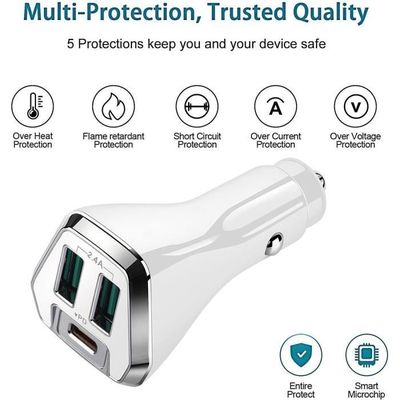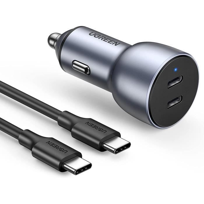 Chargeur Voiture 2x USB 33W + Câble 3 en 1, Wekome - Noir - Français DOUBLE SORTIE USB-C PUISSANTE ET ULTRA-RAPIDE : ce chargeur de voiture est doté de 2 ports de charge rapide USB Type-C Power Delivery (PD) avec jusqu'à 40 W de puissance (chaque port USB-C fournit 20 W de puissance indépendamment), vous permettant de charger deux téléphones jusqu'à 50 % en même temps en seulement 30 minutes en déplacement Adaptateur Allume-cigare Double Port Chargeur De Voiture Pour IPhone Avec Câble USB C Vers Charge Rapide Double Port Cvoepobey Matériau : Alliage d'aluminiumcouleur : argentContenu du colis :2 x 40 W Adaptateur de chargeur de voiture USB C double port2 x 3FT Câble de charge USB C vers USB C 1 mSeul le paquet ci-dessus, les autres produits ne sont pas inclus. Le corps entièrement en aluminium est résistant aux rayures., preuve, et beau. Deux ports] : un port USB QC 3.0 qui vous permet de charger rapidement l'appareil à des vitesses plus rapides, et un port USB 3.1A supplémentaire qui... [Taille compacte et entièrement en métal] Le corps de la taille d'un pouce s'adapte à la plupart des briquets de voiture, libérant plus d'espace, est votre compagnon de voyage idéal pour une puissance non-stop sur la route. Le matériau métallique peut réduire la chaleur pendant le processus de charge, tout en maximisant la vitesse et l'efficacité de charge. Chaque câble USB C vers C dispose d'une puce intelligente qui correspond automatiquement au courant requis par l'appareil pour protéger votre téléphone contre la surcharge. [Protection de sécurité] Le chargeur de voiture est livré avec un contrôle intelligent de la température et un système de protection multi-sécurité, empêchant la surchauffe, la surintensité et les courts-circuits.