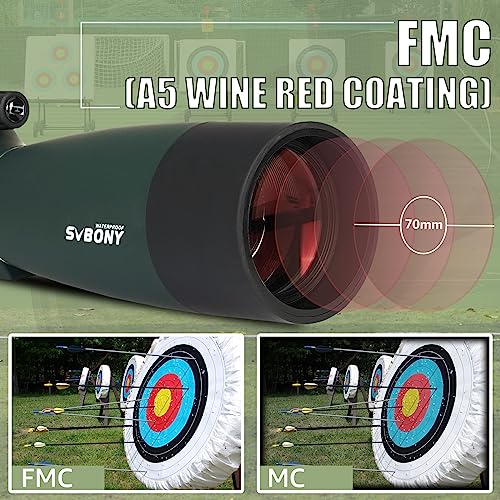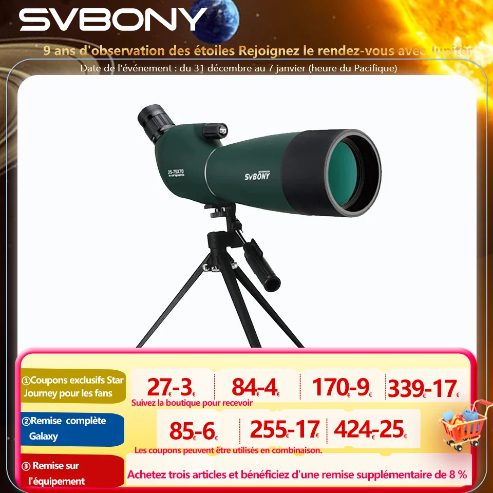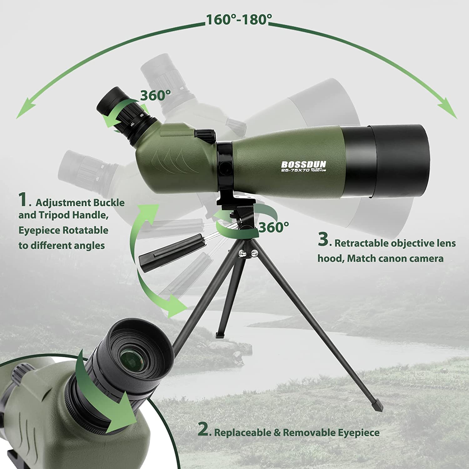 Livré avec un adaptateur de digiscopie de smartphone New Design, vous permet de prendre des photos et des vidéos de ce que vous avez observé 2 cache-poussière pour oculaire., 1 chiffon de nettoyage., 1 notice d'utilisation. Objectif grand oculaire amélioré de 23mm adaptateur digiscoping pour smartphone Champ de vue plus large : Longue-Vue a un objectif de 80 mm ; qui fournit un champ de vue à 131-65., 5ft/1000yards; augmente également la transmission lumineuse et délivre des images nettes SV28 longue vue avec trépied, vous pouvez ajuster le trépied de haut en bas; la longue-vue dispose également d’un filetage d’interface 1/4 qui convient à tous les trépieds de caméra standard Les prismes BaK-4 de haute densité assurent une bonne transmission lumineuse, délivrant des images claires et contrastantes, même dans des conditions de faible luminosité est livré avec un trépied robuste qui tourne de 360 degrés pour vous donner la liberté de choisir la vue que vous voulez voir Système de double mise au point pour un ciblage rapide et précis HD BAK4 Optique entièrement multi-revêtement pour des vues vives Longue-vue Zoom Sportif 50m 25-75x70 BOSSDUN - Avec Trépied Et Adaptateur Téléphone - Pour Observation Oiseaux, Chasse, Astronomie Télescope Observation Oiseaux Prisme BAK4 Longue Vue Svbony SV28 Longue Vue 25-75x70 Bak4 Porro Prise Iperéable... IPX6 imperméable au brouillard; Longue-vues a une qualité IPX6 imperméable; peut faire face à des conditions météorologiques complexes; prolonger efficacement le temps d'utilisation Focus double ; deux roues de focalisation; la grande roue de mise au point est utilisée pour la mise au point grossière; la petite roue de mise au point est utilisée pour la mise au point fine; et les deux roues de mise au point sont plus faciles à utiliser et vous aident à voir les détails de la cible éloignée HD Longue Vue Double Foyer 25-75x70 Vidéo de marchand Livré avec un adaptateur digiscoping smartphone, vous permet de prendre des photos et des vidéos de ce que vous avez observé. ESSLNB Longue Vue 25-75X70 Longue Vue Tir Sportif BAK4 Prisme avec Trépied Adaptateur 70mm Grand objectif; forte capacité de collecte de lumière dans un environnement à faible luminosité; il peut fournir une vue claire et lumineuse; Longue-vues sera idéal pour l'observation d'oiseaux; Tir sur la cible et observation de la lune la grande roue de mise au point est utilisée pour la mise au point grossière; la petite roue de mise au point est utilisée pour la mise au point fine; et les deux roues de mise au point sont plus faciles à utiliser et vous aident à voir les détails de la cible éloignée Trépied robuste et portable Longue-Vue avec ombrage intégré protège l'objectif des gouttes de pluie et de la neige; évite les changements environnementaux soudains aux dommages