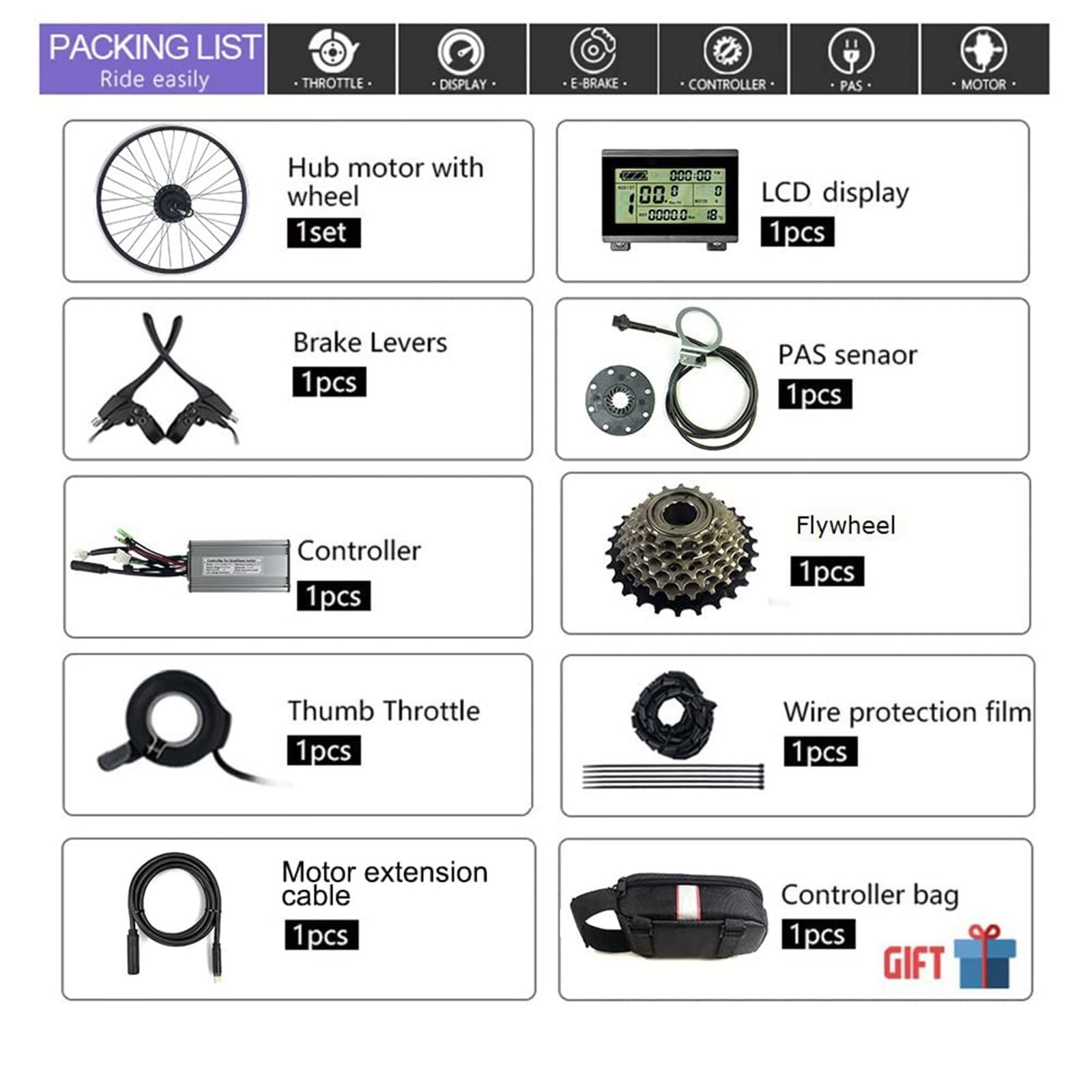 Kit de Conversion de Vélo lectrique 20 po Roue de Moteur d'Entranement 2 poignées de frein., 6 sangles. Moteur Vélo 48V écran LCD MccoMMon Kit Vélo électrique 1500 W 48 V 26" - Roue Arrière Roue Arrière Moteur Vélo électrique 26 Pouces 1 x Binding Post (boîte jaune)., 1 écran LCD. Roue Avant 26 Hub Motor Kit Vélo Électrique Moteur 48V/1000W E-Bike... 1000W 48V Vélo Electrique 26 Roue Arrière Brushless Moteur Hub... Écran LCD intelligent : affichage en temps réel de la vitesse, du kilométrage, du niveau de la batterie, des erreurs et d'autres informations pour optimiser les horaires et améliorer l'expérience de conduite. Matériaux de haute qualité : les moteurs sans balais et sans engrenages avec des motos en alliage d'aluminium haute performance assurent vitesse, performance et durabilité, adaptés à une variété de besoins de conduite. Forte puissance et performance efficace : le couple maximal du moteur atteint 55 Nm, qui peut facilement gérer les pentes ; l'efficacité du moteur est ≥ 80 %, et le système Power Assist 1:1 assure une conduite efficace. Système d'assistance électrique : 1:1., Commande : contrôle 35 A Poignée de frein : cinq étoiles Niveau d'étanchéité : IP54 Clapet de l'accélérateur : tournez l'accélérateur. Haut degré d'étanchéité : avec un degré d'étanchéité IP54 et résistant à la poussière, il protège efficacement les composants internes, prolonge la durée de vie et s'adapte à une variété de conditions météorologiques. Type : volant d'inertie à traction arrière Tension : 48 V Puissance : 1500 W Dimensions : 57,2 x 57,2 x 8,2 cm / 22,5 x 22,5 x 3,22 pouces Poids : environ 13 kg., Couple maximal : 55 N., M Rendement : = 80 %.