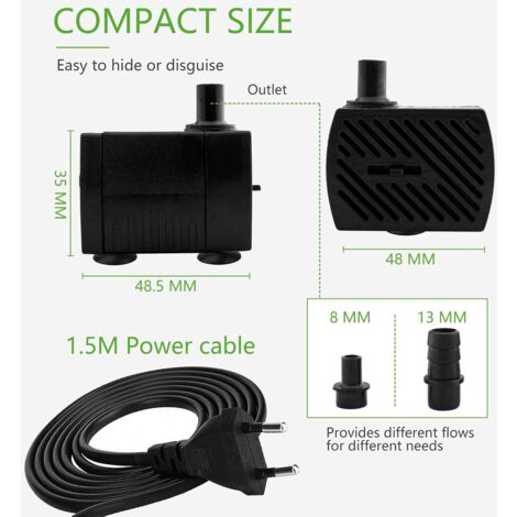 Facile à transporter : son design compact et léger rend cette pompe portable pour une utilisation en extérieur dans les jardins ou pendant les sorties de pêche Pompe Eau USB Portable Pompe Submersible USB 3 W 500 L/h Pour Fontaine Rocaille Aquarium Avec Alimentation 5-6V Usb Caractéristiques : * Connectivité USB pratique : cette pompe submersible dispose d'une prise USB, permettant une connexion facile aux ordinateurs, banques d'alimentation et prises de charge de téléphone portable, ce qui la rend parfaite pour diverses applications comme les fontaines de bureau et les aquariums. Vertical 1m Micro pompe Submersible USB 5V Mini pompe à eau pour... Dimensions : 43 x 38 x 37,5 mm., Couleur : noir, blanc., Puissance : 3 W. Débit maximal : 500 l/h., Hauteur maximale : 1 m., Tension : 5-6 V. YOSOO pompe submersible USB Mini pompe submersible prise USB DC sans... Caractéristiques : Nom du produit : pompe submersible 6 V CC., Matériau : plastique. * Design compact et portable : son design léger et compact le rend facile à transporter et à utiliser à l'extérieur, que vous pêchiez ou améliorez votre jardin avec une rocaille miniature. Débit élevé pour une circulation optimale : le puissant débit de 500 l/h garantit un mouvement efficace de l'eau dans les piscines et les aquariums tout en fonctionnant efficacement Pompe Aquarium USB Silencieuse, Mini Pompe Eau Submersible avec Filtres, Bassin Fontaine Filtration Eaux Accessoires Automatique DC 5V (250L/H 2.4W * Fonctionnement silencieux : conçue pour une performance silencieuse, cette pompe fonctionne silencieusement dans divers environnements tels que les salons, les chambres et les études, pour vos animaux aquatiques ne sont pas dérangés. Capacité de course continue : parfaitement adaptée pour une utilisation prolongée avec la possibilité de fonctionner en continu pendant 24 heures sans interruption