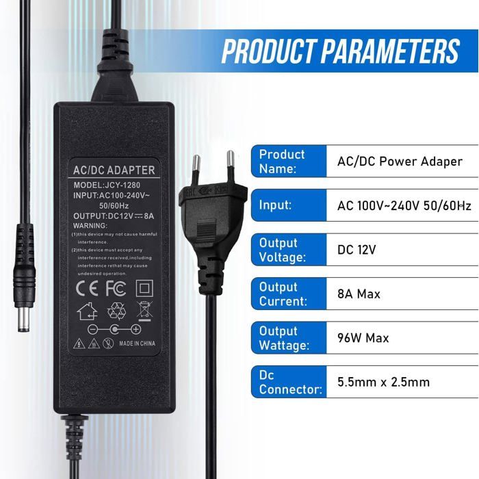 Bloc Alimentation 12v INextStation Bloc D'alimentation CC 12 V 3 A 36 W - Adaptateur Secteur AC 100-240 V Vers DC 12 V Prise EU Pour Bande LED, Caméra De Vidéosurveillance, DVR, Routeur Protections Surtension Surintensité BW Bloc d'alimentation 12 V 3 A 36 W CC 100-240 V AC vers 12 V CC TONYSA Transformateur de puissance 300W, convertisseur de tension AC... Parfaitement compatible avec les bandes lumineuses LED, les caméras de surveillance CCTV, les enregistreurs DVR, les routeurs, les amplificateurs audio, les hélicoptères, les jouets et plus encore. Veuillez vérifier les exigences de tension et de courant de votre appareil avant d'acheter. 【Conception Compacte et Fiche UE】 Son format compact plug-in s'insère directement sur votre prise murale sans bloquer la seconde prise. Ce bloc d'alimentation 12 V 3 A 36 W fournit une énergie stable et efficace pour une variété d'appareils 12 V. Équipé d'une fiche standard européenne (EU Plug), il est prêt à l'emploi. 【Câble Long et Utilisation Pratique】Avec un câble de sortie de 110 cm et une longueur totale de 123 cm, il vous offre une grande liberté de placement pour connecter vos appareils, même si la prise est difficile d'accès. Assurez-vous que votre appareil nécessite une entrée 12V et que la puissance est adéquate. Adaptateur ca/cc 220V à 12 V, transformateur LED, ... – Grandado