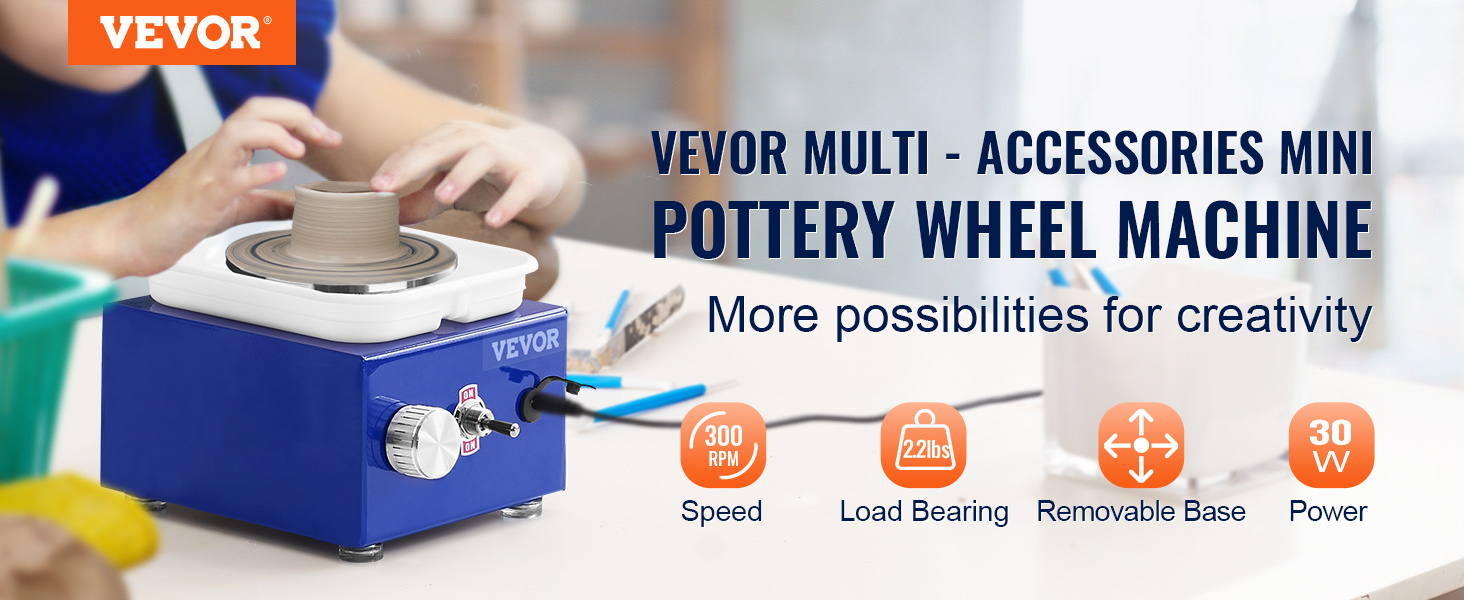 Durable et stable Le plateau tournant robuste en aluminium offre une vitesse réglable de 0 à 140 tr/min et permet une rotation dans le sens horaire ou antihoraire. Caractéristiques principales Mini ensemble de tours de potier Conçu pour les enfants et les débutants, ce tour à poterie offre une plage de vitesse constante de 0 à 140 tr/min grâce à un puissant moteur de 30 W. Un cadeau mémorable Que ce soit pour des projets en atelier, des cours ou des loisirs créatifs à la maison, ce kit de tour de potier est un cadeau attentionné pour vos proches. Doté d'une roue en aluminium robuste et d'un interrupteur bidirectionnel pour la rotation avant/arrière, ce petit tour de potier à vitesse réglable permet de réaliser des techniques plus créatives Contrôle fluide et flexible : Le tour permet un réglage facile de la vitesse de 0 à 140 tr/min grâce à un seul bouton. 1 x Ensemble en bois de 8 pièces VEVOR Mini Tour de Potier Électrique, Roue de Poterie avec Plateau Tournant de 158 mm, Rotation Avant et Arrière, Vitesse Réglable, avec Outils de Façonnage, pour Artisanat, Bricolage Domicile, Vert au meilleur prix - Comparez et achetez VEVOR Mini Tour de Potier Électrique, Roue de Poterie avec Plateau Tournant de 158 mm, Rotation Avant... 2 x pinceaux (un fin, un épais), 1 x adaptateur secteur, 1 clé hexagonale 1 x Manuel d'utilisation Tour De Potier électrique VEVOR Roue De Poterie 28 Cm 350 W Machine A Tour De Potier Blanc Electrique Avec Pedale, Mini Roue De Poterie Avec Bassin Amovible Plateau Tournant, Outil Pour Ceramique Argile Fabrication Bricolage Mini Tour Poterie Son astucieux coffre de rangement intégré permet de ranger vos outils et de préserver un espace créatif propre. Son plateau tournant en aluminium de 15 cm peut supporter jusqu'à 3 kg d'argile, permettant aux utilisateurs de tous niveaux de s'adonner facilement au plaisir de la poterie. Il convient à tous les niveaux, des débutants aux créateurs expérimentés, et stimule l'inspiration à tout moment De la sculpture au façonnage en passant par la peinture, les débutants ont tout ce qu'il faut pour explorer leur créativité Robuste et stable, il supporte jusqu'à 3 kg d'argile, idéal pour explorer la créativité céramique à tous les âges Passez du sens horaire au sens antihoraire pour s'adapter à différents styles de façonnage. Vitesse de rotation : 0-140 tr/min, Bruit : ≤ 60 dB Facile à nettoyer et à utiliser Compact et peu encombrant, ce tour de potier pour enfants présente une surface lisse et facile à nettoyer. Design élégant et amusant Avec ses couleurs fraîches et ses détails ludiques, comme son cadre en forme d'ours, ce petit tour de potier apporte du charme à chaque séance de création. Mini tour de potier pour enfants et adultes Ce tour de potier est équipé d'un moteur de 30 W et d'un plateau tournant en aluminium de 15 cm, ce qui le rend idéal pour tous les âges. Son design élégant et son rangement intégré assurent un espace de travail ordonné et stimulant. Spécification Numéro de modèle de l'article : YTMN-04, Puissance : 30 W VEVOR Mini Tour de Potier Roue de Poterie Électrique 2 Disques 6,5 cm 10 cm 30 W 1 x 12 peintures de couleurs, 1 x Palette, 2 x Argile