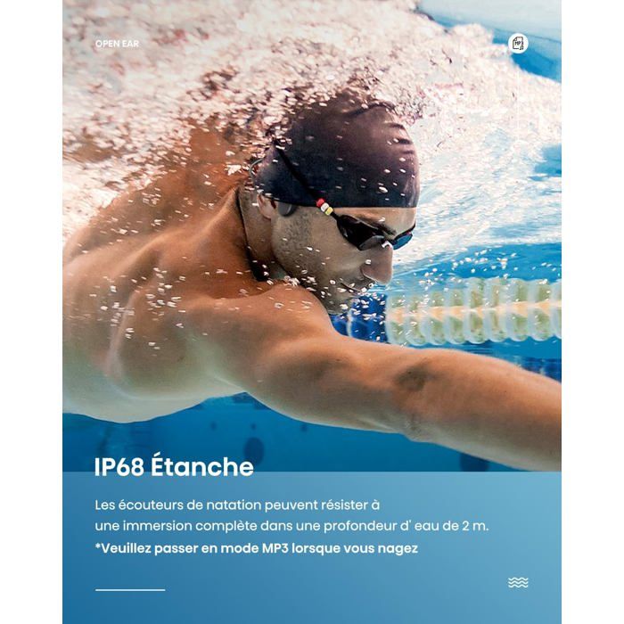 Seulement 5 minutes de charge pour 30 minutes de musique - Parfait pour les déplacements. Casque Natation MP3 32Go IP68 Sport Running Cyclisme Lecteur Mp3 Écouteurs Conduction Osseuse HIFI WALKER - Étanches IPX8 Avec 32 Go Lecteur Mp3 Intégré 32go Casque Bluetooth IP68 32 Go Voistek Casque Bluetooth ouvert et lecteur Vidéo de marchand Grâce à sa mémoire intégrée de 32 Go, profitez de la musique même sans téléphone portable sous l'eau. Son clair et basses profondes : La technologie de conduction osseuse transmet un son puissant à travers les pommettes - aigus clairs et basses riches avec une portée ouverte Puis-je utiliser ces écouteurs en nageant ? Oui, ces écouteurs sont IP68 étanches et disposent de 32 Go de stockage local pour la musique, parfaits pour la natation ou d'autres activités aquatiques. Port ouvert et sûr : design léger à oreilles ouvertes avec bande en silicone souple pour un ajustement ferme, même pendant la natation ou les sports intenses. Avec une technologie Bluetooth 5.3 et une étanchéité IPX8, ce casque est parfait pour la natation, la course, le vélo, la randonnée et l'entraînement au gymnase... Comment puis-je stocker de la musique sur les écouteurs ? Vous pouvez utiliser le câble de charge USB magnétique inclus pour connecter les écouteurs à votre ordinateur et télécharger de la musique sur les écouteurs. Nos écouteurs sont équipés d'un connecteur USB magnétique qui prend en charge à la fois la charge et le transfert de données. Son clair et basses profondes : la technologie de bruit osseux transmet un son puissant à travers les pommettes – des aigus clairs et des basses riches en cas d'écoute libre. écouteurs étanches Pour Nageurs Casque Natation étanche IPX8 - Mémoire 32Go - Conduction Osseuse Bluetooth 5.3 Casque Mémoire Intégrée 32Go Sport Ce connecteur magnétique offre une étanchéité améliorée (IP68) et une grande durabilité, garantissant des performances fiables même dans des environnements humides. Lumière de sécurité LED pour la course de nuit : la bande LED réglable augmente la visibilité dans un environnement sombre – plus de sécurité lors de l'entraînement en plein air.