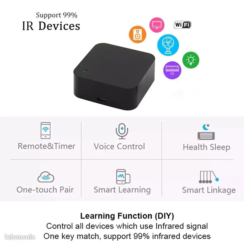 Ouvrez ensuite la télécommande dans l'application et ajoutez d'autres appareils pour réaliser la télécommande. Création Scènes Automatisation Maison TELECOMMANDE INTELIGENTE WIFI IR Tuya , CAPTEUR UNIVERSELLE DE TEMPERATURE ET HUMIDITE, POUR VENTILATEUR ET CLIMATISEUR, TV, DVD, Alexa Google Home Television Connectée Wifi Révolutionnez votre maison intelligente avec cette centrale de télécommande WiFi IR polyvalente. Thermostat intelligent WiFi 2p/4p, système de refr... – Grandado Contrôle de l'application : utilisation facile via l'application Tuya Smart avec interface utilisateur intuitive et accès à distance de n'importe où Scènes intelligentes : permet de créer des opérations automatisées et de connecter plusieurs appareils pour des scénarios personnalisés de maison intelligente Télécommande infrarouge intelligente Broadlink RM4C Mini Bestcon... Intégration intelligente à la maison : compatible avec Amazon Alexa et Google Assistant pour un contrôle vocal pratique de tous les appareils connectés Compatible avec Alexa et Google Assistant, il vous permet de contrôler la voix de divers appareils tels que les climatiseurs, les téléviseurs, les ventilateurs et plus encore. Facile à installer : la télécommande infrarouge intelligente est facile à utiliser et à configurer. Thermostat intelligent WiFi 2p/4p, système de refr... – Grandado La fonction de liaison intelligente permet de configurer des routines complexes, tandis que la vaste bibliothèque de codes infrarouges garantit une large compatibilité avec les appareils. Il suffit de brancher le câble USB, d'appuyer sur le bouton d'appairage et de le connecter à l'application Smart Life.