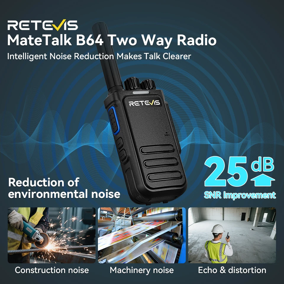 Guide en 6 langues : anglais ; Allemand, espagnol, français, italien et russe. Chargement portable Grâce aux options de chargement portable Type-C/sur socle, votre appareil de communication est toujours prêt à l'emploi, où que vous soyez. Talkies Walkie Retevis B64 Retevis NR630 Talkie Walkie Pour Adulte, Longue Portée Talkie Walkie Lot 2 Paires Radio Professionnelle Talkies Walkies,Walkie-Talkie Longue Portée,station de Radio CB,10 km... Autonomie longue durée Que vous gériez une équipe de sécurité 24 h/24 dans un hôtel ou que vous supervisiez une usine de longue durée, cette batterie longue durée vous permet de rester connecté. Description du produit Retevis MateTalk B64 Radio bidirectionnelle Il capte clairement les sons dans un rayon de 10 mètres et ajuste automatiquement le gain en fonction de la position et de la distance de l'interlocuteur. Alarme d'urgence ; un seul bouton sur la radio bidirectionnelle déclenche les alarmes locales et à distance ; alertez votre groupe des dangers ; que vous soyez en randonnée seul ou en équipe. Conception durable et résistante à l'usure La texture uniforme et le matériau PC et ABS garantissent une résistance aux chocs et à une utilisation quotidienne, ce qui en fait un choix idéal pour les usines, les entrepôts et autres environnements de travail exigeants. Restez concentré sur votre tâche avec VOX. Que vous supervisiez une équipe multinationale sur un chantier ou coordonniez des ateliers de réparation dans différents pays, les talkies-walkies professionnels brisent les barrières linguistiques Idéal pour les ouvriers du bâtiment qui ont besoin d'avoir les mains libres tout en restant connectés. Quels sont les meilleurs talkie walkie Retevis en 2025 ? Nous avons analysé 2 014 talkie walkie Retevis avis pour faire la recherche pour vous Vous pouvez choisir entre le chargeur Type-C et le chargeur sur socle pour une recharge pratique de votre talkie-walkie Appairage facile dans un atelier de réparation automobile dynamique permet aux techniciens de synchroniser les talkies-walkies en quelques secondes ; l'appairage instantané fluidifie les flux de travail ; partagez les mises à jour sur l'état des véhicules ou alertez vos collègues des réparations urgentes sans perdre le fil Parlez simplement pour transmettre, sans appuyer sur le bouton PTT. Talkies walkies Retevis, neuf et occasion