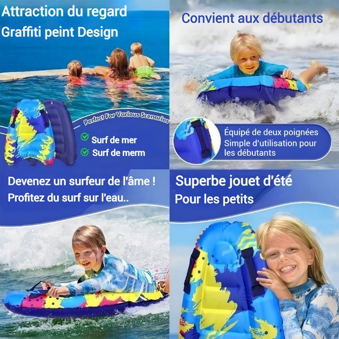 Planche Bodyboard Gonflable Planche Surf Portable Warooma 72cm - Planche Surf Piscine Plage - Poignée Intégrée - Portable Flotteur Aquaplane Plage Planche Gonflable Adulte Planche Surf gonflable pas cher publicitaire Einfeben Bodyboard gonflable Planche de surf gonflable avec poignées, tapis d'aide léger pour... Matériau durable : Le bodyboard gonflable pour enfants en PVC a des coutures parfaites, est résistant à la déchirure et à l’abrasion et ne fuit pas facilement. Très utilisé : les planches de natation gonflables sont adaptées aux enfants pour pouvoir surfer confortablement, mais aussi pour apprendre à nager et développer une bonne posture de nage. Spécification: Matériel: Plastique Couleur: Jaune Taille du produit: 71x45cm Le forfait comprend: 1 x Bodyboard Gonflable Note: 1., Les enfants qui utilisent une planche de natation gonflable Les enfants dans les piscines et les plages doivent être surveillés par un adulte utilisant une planche de surf gonflable. Fonction: Facile à gonfler et à dégonfler : Ce bodyboard gonflable avec soupape de sécurité assure une étanchéité sûre et sans fuite et permet un gonflage et un dégonflage faciles. 【Scellé et étanche】 La planche gonflable enfant est équipée d’une soupape de sécurité qui se ferme hermétiquement et peut être cachée en poussant. 【Largement utilisé】 La taille du planche gonflable piscine de natation gonflable est de 71 x 45 cm, ce qui en fait le meilleur cadeau d’été pour les enfants. Que ce soit dans la piscine ou sur la plage, les enfants peuvent apprendre à nager avec des planches de surf, jouer dans l’eau et profiter de la joie des aventures aquatiques. Taille : le bodyboard gonflable mesure 106,7 cm (L) x 53,3 cm (l) x 5,1 cm (P), pèse 2 kg, peut facilement transporter un surfeur de 102,1 kg. Équipé de 4 poignées confortables, anneaux en D en acier inoxydable pour la connexion de la sangle
