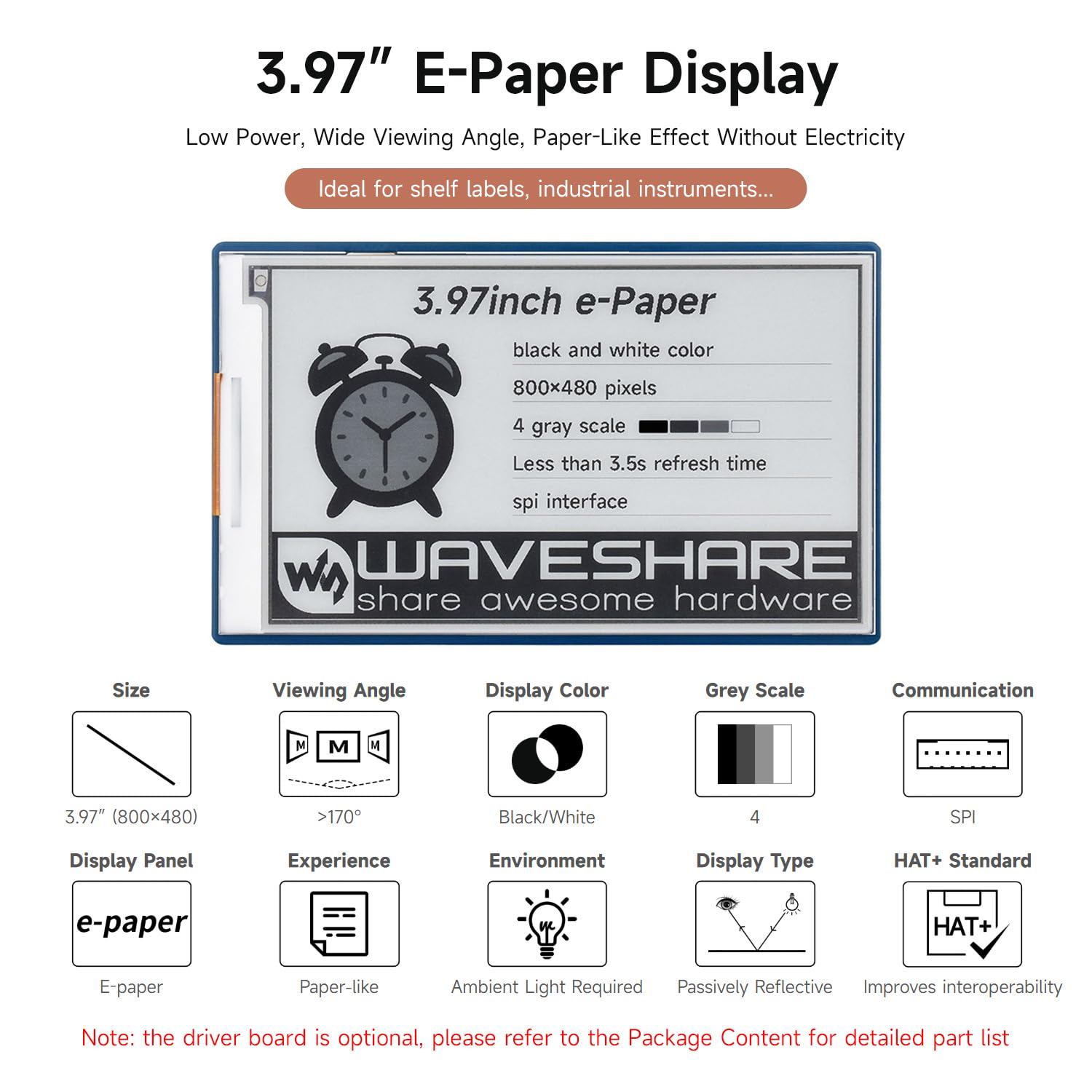 Ultra low power consumption, basically power is only required for refreshing 3.97inch e-Paper raw display (without driver board), Low Power, Wide Viewing Angle, Paper-Like Effect Without Electricity. Ideal for price tags, shelf labels, industrial instruments écran E-ink 3.97 Pouces 800x480 SPI Raspberry Pi Waveshare 7.5 Inch E-Paper Display Hat Module V2 Kit 800x480 Resolution écran E-paper Waveshare 2.9inch Touch E-Paper E-Ink Display Hat for Raspberry Pi 5-Points Capacitive Touch 296×128 Pixels Black and White Partial Refresh Support SPI Interface No backlight, keeps displaying last content for a long time even when power down Ideal for price tags, shelf labels, industrial instruments