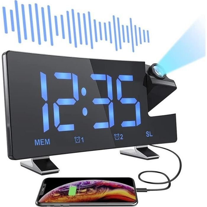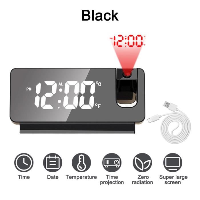 LED Digital Projecteur Réveil Calme horloge électronique numérique... [EFFET DE PROJECTION] L'horloge numérique peut être clairement projetée au plafond, avec une projection réglable à 180 ° et une lumière rouge douce, qui n'éblouira pas la nuit. [FONCTIONS MULTIPLES] Avec réveil intelligent, miroir, calendrier perpétuel, fonction d'affichage de la température et de l'humidité intérieures, pour répondre à davantage de besoins. Alarme Double Réveil Réveil,White On Black A--Réveil Électronique À Projection Numérique Led Thermomètre Hygromètre Intégré 210 x 75 x 23 mm/8,3 x 3 x 0,9 poucesPoids : env., 280g/9., 9ozBatterie : 1 pile bouton CR2032 150 mAh (intégrée)Matériau : ABSFonctions : thermomètre, miroir, calendrier, alarme, mesure de l'humidité Liste des packages : 1 x Réveil 1 câble USB., 1 manuel d'utilisation Commandez dès maintenant le Réveil avec projection à 180°, affichage numérique LED et fonction de protection oculaire et facilitez-vous la vie avec un réveil pratique et élégant Fonctionnalité :1., [SCÈNES APPLICABLES] Le réveil à projection numérique s'applique à la chambre, au bureau, à la voiture ou à l'hôtel pour vous rappeler de faire quelque chose à une heure fixe. Ahlsen Led Grand Écran Radio Miroir Projection Réveil Photosensible