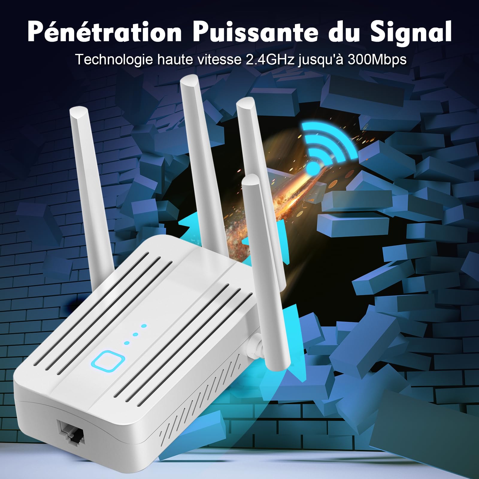 Installation Express: Branchez près de votre routeur Appuyez sur le bouton WPS Déplacez l'amplificateur dans la zone à couvrir Pack Inclus: 1× répéteur WiFi puissant 1× guide d'installation illustré Les Meilleures Répéteur Wifi Puissant Amplificateur - Noël 2025 Les trous de refroidissement sur les deux côtés augmentent la capacité de dissipation de la chaleur du multiplicateur de portée amplificateur wifi. Répéteur WiFi 300 Mbps Repeteur Wifi Amplificateur WiFi 2025 - 4 Antennes - 2 Ports LAN - Couverture 2640 M² - Mode Répéteur/AP/Routeur - Installation Facile Amplificateur Signal Maison Bureau Extendeur WiFi Ports LAN Compatible Box Grâce à ses 4 antennes haute puissance, ce WiFi extender couvre tous les espaces difficiles d'accès. 【Vitesse de transmission WiFi de 300 Mbit/s】Augmente rapidement et facilement la portée du réseau Wi-Fi jusqu'à 300 Mbit/s pour des transferts de données fluides et rapides. Avec ses 4 antennes, il couvre jusqu'à 360° et boost le signal jusqu'à 300Mbps. Compatible avec toutes les box (Free, Orange, SFR, etc.). Les 2 ports LAN... prend en charge la connexion simultanée de plus de 25 appareils sans fil, tels que l'iPad, l'ordinateur portable, le téléphone portable, la caméra IP, l'imprimante, l'appareil Alexa et d'autres appareils, ce qui vous permet de partager la vie WiFi avec votre famille et vos amis. Le puissant repeteur WiFi est équipé de 4 antennes à gain élevé pour étendre le signal WiFi sans fil du routeur afin d’obtenir une couverture complète à 360° et une transmission de données stable, sans se soucier des problèmes de signal dans les coins. Répéteur WiFi Aplificateur WiFi Signal Booster,Repeteur WiFi Puissant... 【Couverture étendue】Un seul routeur a une couverture WiFi limitée et crée toujours une zone morte WiFi. Étendez votre Wi-Fi aux zones difficiles d'accès et éliminez les zones mortes Wi-Fi. 【Stable Signal & Universal Compatibility】Augmente rapidement et facilement la portée du réseau WiFi avec Wifi extender, compatible avec tous les routeurs WiFi courants. Répéteur WiFi Haute Performance Notre amplificateur de signal WiFi 300Mbps élimine définitivement les zones mortes de votre réseau. Equipé d'un câble réseau.