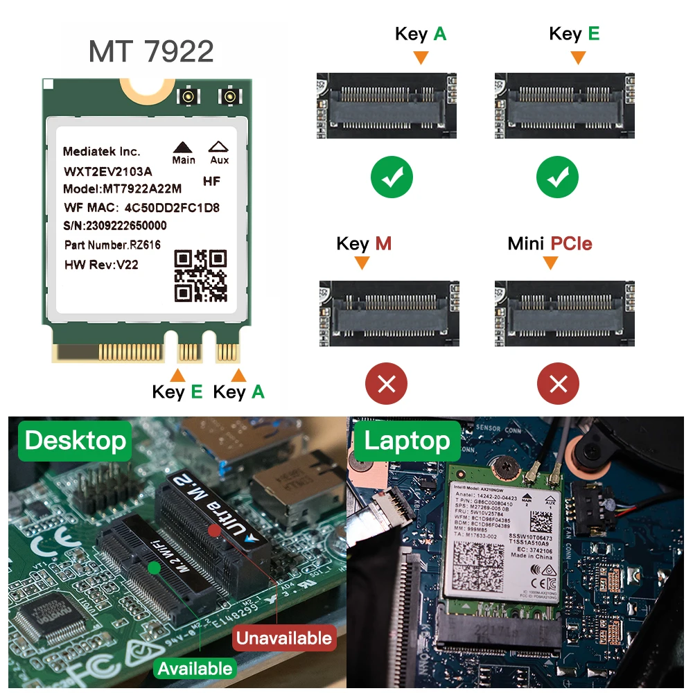 Carte WiFi 6E Carte Sans Fil WiFi 6E Intel AX210 NGW Bluetooth 5.2 Adaptateur Réseau Upgrade Ordinateur Portable MT7922-Carte réseau WiFi 6E 5400Mbps, adaptateur sans fil M.2 NGFF Intel AX210 PCIe - Carte Réseau Sans Fil Intel Ax210 Pcie, 5374mbps, Wi... Spécification: Type d'article: Module sans fil WiFi6E2,4 g / 574 Mbps + 5g / 2,4Gbps + 6g / 2,4 Gbps Bluetooth: Bluetooth 5., 2 Systèmes compatibles: pour WINS10 / 11, pour Linux Application: approprié pour l'interface M. Carte sans fil wifi6e 1 x entretoise 1 x vis Technologie Tri Band: Support complet de la bande Tri avec des fréquences 2,4 GHz, 5 GHz et 6 GHz, offrant des options de connectivité réseau polyvalente pour diverses applications, des connexions de données stables et rapides. 1., Technologie Tri Band: support complet de la bande Tri avec des fréquences 2,4 GHz, 5 GHz et 6 GHz, offrant des options de connectivité réseau polyvalentes pour diverses applications, des connexions de données stables et rapides., 2., Transfert à grande vitesse: la carte sans fil comprend une vitesse de transmission allant jusqu'à 5374 Mbps, avec 574 Mbps sur 2,4 GHz et 2,4 GbBluetooth 5., 2: équipé de Bluetooth 5., 2 pour des vitesses de connexion plus rapides et une efficacité énergétique plus élevée, le module d'adaptateur de carte sans fil permet des connexions stables avec une variété d'appareils Bluetooth, améliorant la commodité quotidienne., 4., Large compatibilité: la carte réseau sans fil prend en charge pour WinS 10 11 et pour les systèmes d'exploitation Linux pour des performances optimales, l'interface M. 2 universellement compatible avec une variété d'appareils, offrant une polyvalence exceptionnelle. Facile à utiliser: facile à installer et à mettre à niveau avec l'interface M. 2, conception compacte pour une installation rapide et des mises à niveau sans opération complexe, améliorant l'efficacité et la commodité pour les utilisateurs. Expérience rapide avec WiFi 6E et Bluetooth compatible 5.2 pour la mise en réseau. Profitez de performances Internet sans fil rapides avec cette carte réseau...