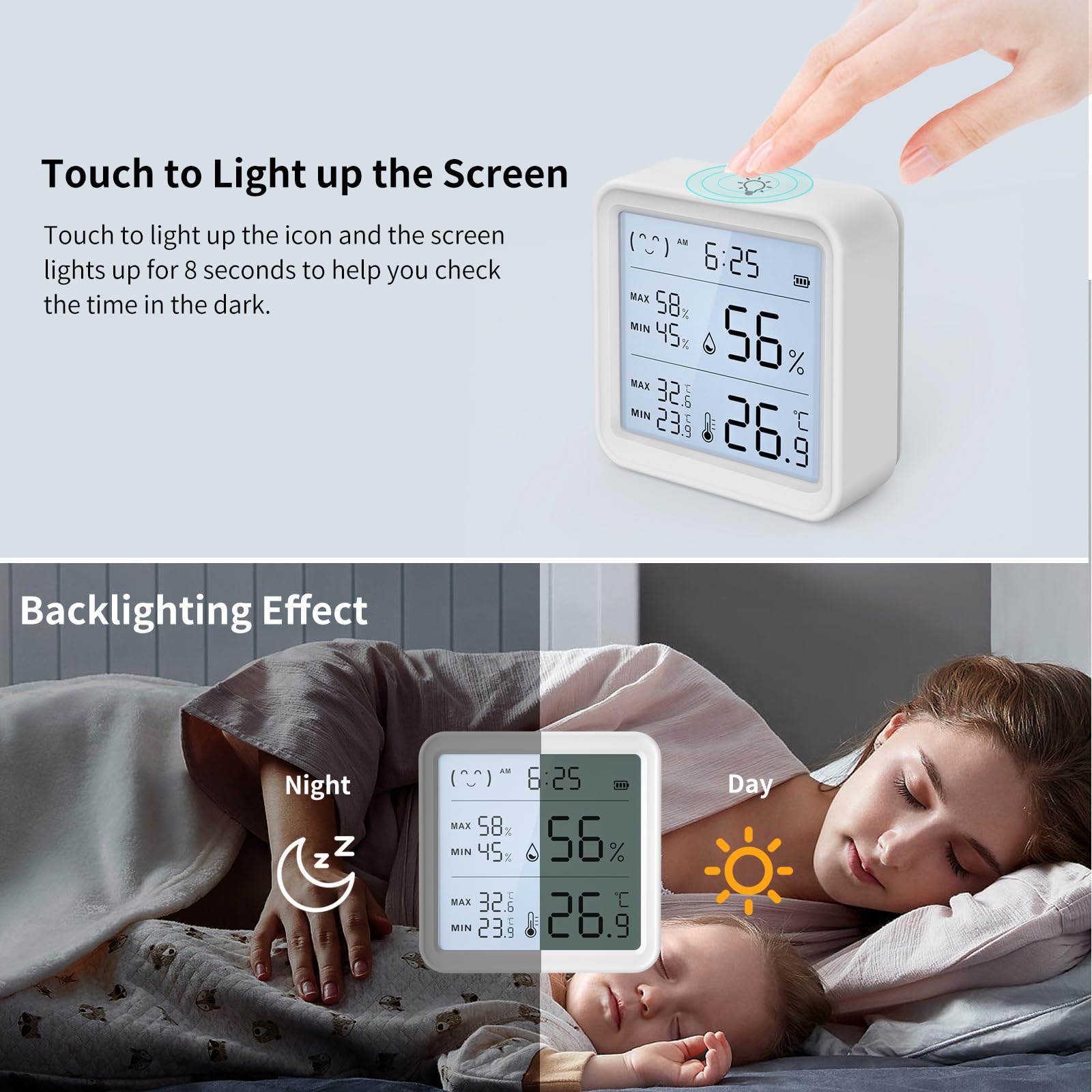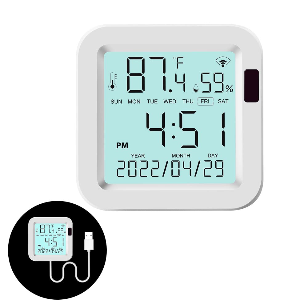 WIYETY Thermomètre hygromètre WiFi Capteur de température WiFi Capteur d'humidité avec capteur externe, application de surveillance à distance avec application Tuya, hygromètre WiFi Thermomètre intérieur extérieur Particularités : 1., Fonction Wi-Fi pour la surveillance à distance via l'application, idéale pour contrôler en temps réel la température et l'humidité de n'importe où., 2., Le capteur intégré et externe permet de mesurer simultanément deux endroits différents., 3., Enregistrement et exportation des données de mesure pour une évaluation et une présentation graphique faciles dans l'application. Idéal pour protéger les zones sensibles telles que les serres, les caves à vin ou les salles de serveurs. Longueur de la sonde externe : 1 m. Précision de la température : ± 1 °C. Cela permet une réaction rapide aux changements de climat ambiant, ce qui est particulièrement important dans les environnements sensibles. Précision fiable : le capteur offre des mesures précises de la température et de l'humidité avec un minimum d'écart. Thermometre Interieur Exterieur 1 Hygromètre WiFi Pour Voiture, Maison, Intérieur Et Extérieur Thermomètre Extérieur Capteur De Thermomètre Hygromètre Wifi : Moniteur Intelligent De La surveillance à distance en temps réel garantit que la température et l'humidité restent toujours en vue, que vous soyez à la maison, au bureau ou en déplacement. Caractéristiques : Plage de température intégrée : -9,9 °C ~ 60 °C. Ainsi, deux endroits différents peuvent être surveillés en même temps, ce qui élargit considérablement les possibilités d'utilisation, par exemple à l'intérieur et à l'extérieur ou dans des zones séparées. Avec l'hygromètre avec application à distance, vous avez le contrôle de la température et de l'humidité dans votre maison ou votre serre à tout moment et n'importe où Restez connecté partout : grâce à la fonction Wi-Fi, le capteur peut être surveillé à tout moment et de n'importe où via l'application. Il est pris en charge par le contrôle convivial de l'application. Capteur intégré et externe : équipé d'un capteur intégré pour l'environnement direct et d'un capteur externe avec câble pour les zones éloignées ou difficiles d'accès. Thermomètre hygromètre WiFi intelligent, capteur de température et d'humidité intérieur/extérieur Bluetooth, application thermomètre WiFi Alexa/Google... Grâce à son placement flexible et à sa connexion stable, l'appareil convient aussi bien pour un usage domestique que professionnel. Idéal pour contrôler les changements à long terme et pour des évaluations précises du climat. Contenu de l'emballage : 1 thermo-hygromètre Wi-Fi.
