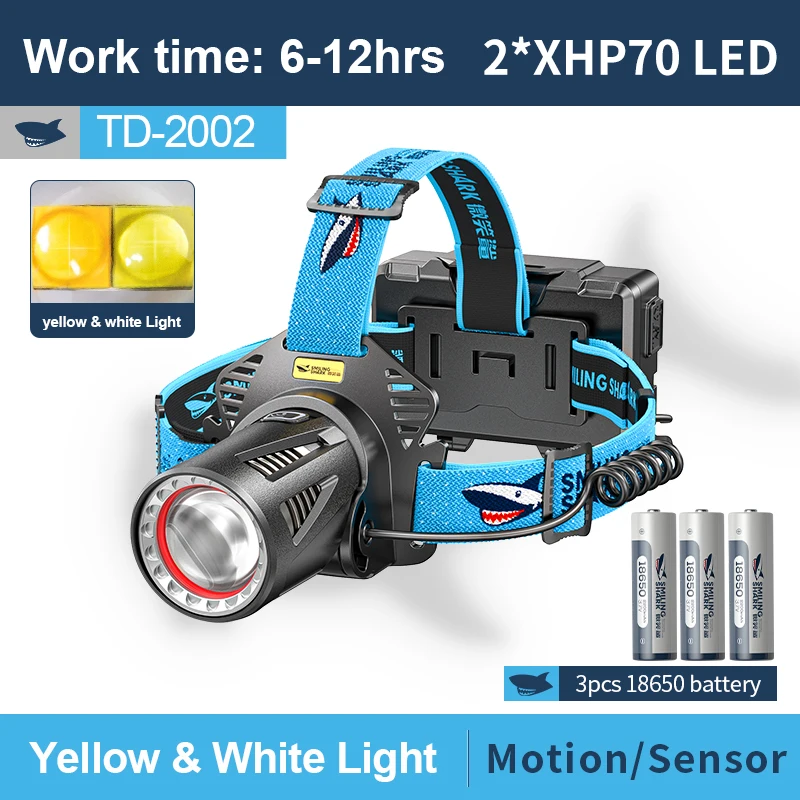 Smiling Shark Lampe Frontale LED, Angle Large 6*LED Bandes Super Double Focalisation pour la Précision et la Puissance] Grâce à son système unique à double focalisation, le frontal TS-2 propose des faisceaux puissants et doux pour une visée précise et une portée étendue 2 Projecteurs Orientables Spot Flood Smiling Shark Headlamp, 2-Pack 230° Wide Angle 3 X Multicolor LED Strip Rechargeable Waterproof Motion Sensor For Camping Hiking LED Headlamp Camping Light [Energy Efficiency Class A Smiling Shark TS-2 2400mAh Smiling Shark TS-2 Lampe Frontale, LED Head Lamp Rechargeable 2400mAh 2x Projecteur Orientable & Flood & Strobe Headlamp avec Capteur de Mouvement pour Camping, Jogging, Randonnée, Course (2 Pack) Que vous ayez besoin d'un faisceau longue portée ou d'une lumière plus tamisée pour les travaux de proximité, ces frontaux s'adaptent instantanément. Autonomie Longue]La lampe frontale fonctionne avec des batteries de 2000 mAh, offrant jusqu'à 8H d'utilisation continue sur une seule charge, vous assurant d... It features strong and weak spotlights, strong and weak floodlights, plus a strobe mode—ensuring powerful illumination for every adventure. 【Fonctionnalités Mains Libres】 Un capteur de mouvement intégré vous permet d'allumer ou d'éteindre la lampe frontale d'un simple geste de la main, gardant ainsi les mains libres pour le travail ou l'aventure. 【Autonomie Prolongée】 Équipé d'une batterie rechargeable 2400mAh, ce phare frontal offre jusqu'à 10 heures d'utilisation continue sur une seule charge, et se recharge entièrement en seulement 1 à 2 heures. Associée à un bandeau réglable et confortable, elle offre une utilisation prolongée sans inconfort.