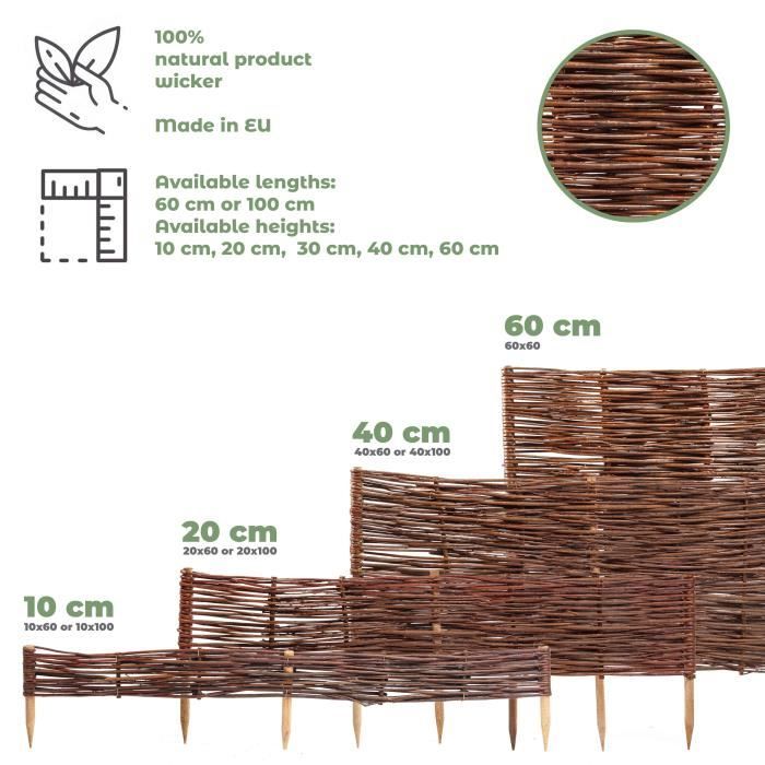 C'est la solution idéale aussi bien pour les jardiniers enthousiastes que pour ceux qui font leurs premiers pas dans la conception de l'espace extérieur. Polyvalence : la bordure de parterre en bois est un produit avec de nombreuses possibilités d'utilisation. Esthétique : la clôture en bois organise non seulement la pièce, mais la décore également. Montage facile : les piquets intégrés et légèrement pointus permettent une insertion immédiate de la clôture dans le sol – sans perçage, sans vis et sans outils supplémentaires. Tubiaz Bordure de jardin en bois bordure de parterre bordure de tonte 200*40*1.5cm Anthracite Grâce à sa construction modulaire, vous pouvez facilement ajuster la longueur de la clôture en fonction de vos besoins. Cela signifie que la grille de clôture ne perd pas son charme et sa fonctionnalité même après de nombreuses années d'utilisation. Bordure De Parterre En Bois - Hauteur : 60 Cm X Largeur : 100 Cm... Toutes les images présentées dans la vente aux enchères ont été créées par nos soins et montrent l'aspect réel du produit. Cette solution classique s'intègre dans n'importe quelle pièce grâce à sa simplicité et sa finition solide, quel que soit le style de jardin ou la taille de la parcelle. Elle est idéale comme séparation discrète entre la pelouse et les parterres, comme protection contre les animaux domestiques ou comme bordure naturelle autour des chemins de jardin. Bordure Jardin 10cm KOTARBAU® 1 Bordure Enroulable 10 X 110 Cm - Clôture En Bois De Pin Bordures Jardin Floranica Rollborder Clôture flexible en bois de pin 200 x 10 cm Non-traité Bordure de parterre de gazon Clôture de jardin. 17,07 €/1m. Note moyenne : 4.5 sur... Caractéristiques techniques : longueur totale : 200 cm, hauteur : 10 cm, hauteur avec élément d'insertion : 25 cm, épaisseur de la planche : 1,5 cm, poids : 1,8 kg, matériau : bois de pin, couleur : flammé.
