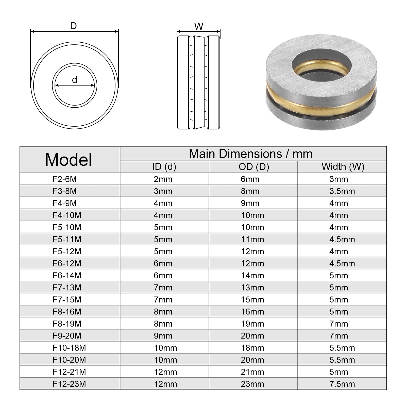8 stücke RC Molle F6-12M Axial Ball Schub Lager ... – Viceal L'arbre et la rondelle de boîtier en laiton offrent une dureté élevée et uniforme, une bonne résistance à l'usure. Roulement Axial Laiton Abec3 6mm X 12mm X 4.5mm F6-12M Acier Chromé Mini Avion Roulement à Billes Roulement Laiton ABEC3 Un ensemble bille et cage, accompagné d'une rondelle d'arbre et d'une rondelle de logement, constitue la structure des butées à billes. DIMENSION] - Diamètre alésage=6mm, diamètre externe=12mm, épaisseur=4,5mm [MATÉRIEL] - Les billes de roulement en acier chromé (AISI 52100) ont une grande résistance à l'usure, aux hautes températures et à la dureté élevée; Cage en acier au carbone [CAPABILITÉ] - Capacité de charge dynamique (Cr): 1,9kN; Capacité de charge... QUARKZMAN 4pcs F6-12M Miniature Poussée Bille Roulements 6mm Alésage 12mm OD 4,5mm Épais Chrome Acier avec Rondelles pour Convoyeur Systèmes Machine Outils : : Commerce, Industrie et ScienceTaille - Alésage de 6 mm, diamètre extérieur de 12 mm, épaisseur de 4,5 mm Matériau - Fabriqué en acier au chrome (AISI 52100), il présente une grande résistance à l'usure, une... Faible bruit et longue durée de vie, facile à entretenir. [TAILLE] - Diamètre de l'alésage=6mm, Diamètre extérieur=12mm, Épaisseur=4., 5mm Maintenez l'environnement de travail du roulement propre et lubrifiez-le à temps. Facilite les inspections de montage et de maintenance cela. [CARACTÉRISTIQUES] - Les composants séparables des roulements à billes de poussée sont interchangeables. Description :Interchangeables sont les composants séparables des butées à billes.