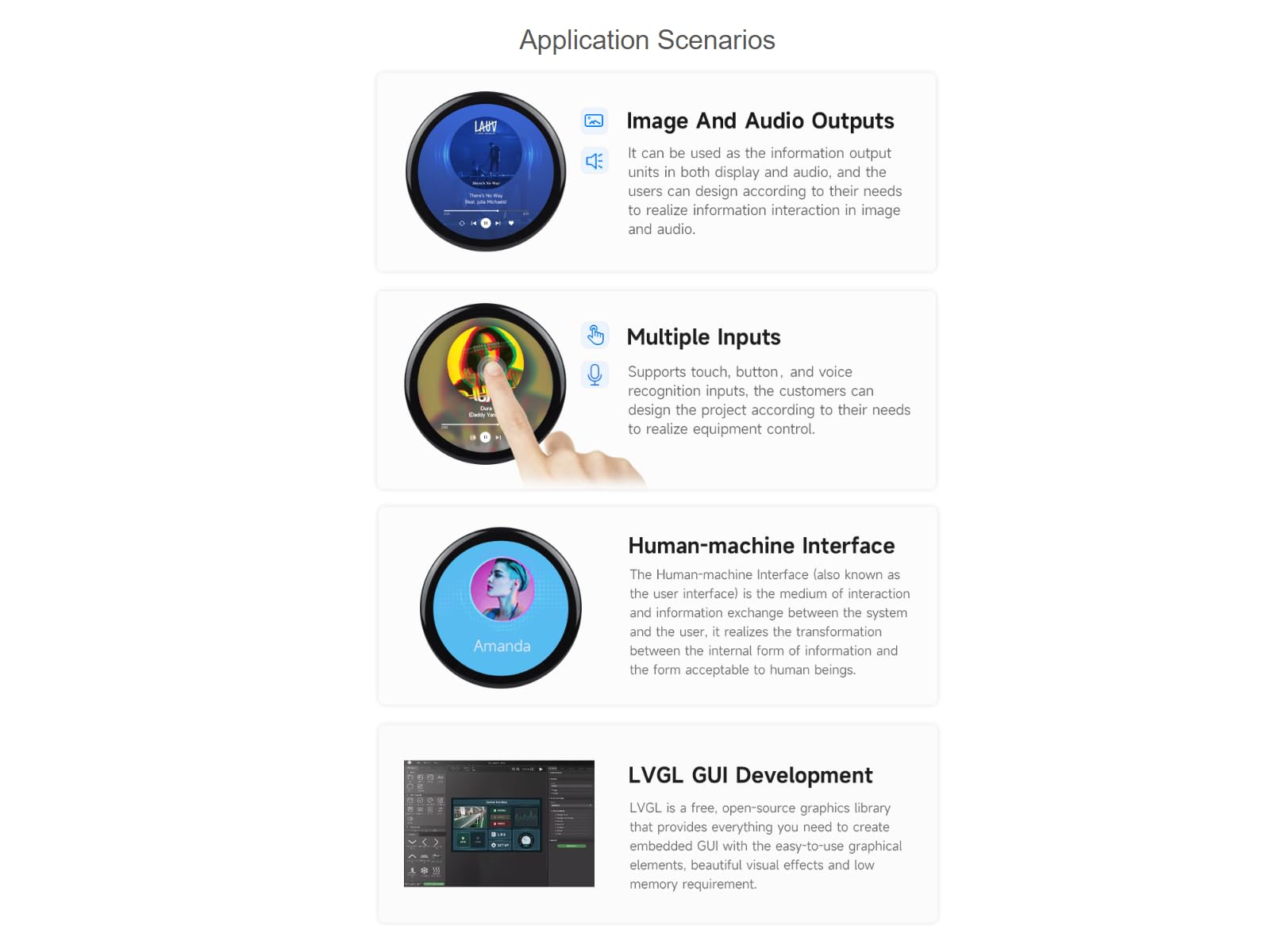 écran LCD 1.85 Pouce 360x360 Waveshare ESP32-S3 1.85 Inch Round LCD Development Board, 360 X 360, Supports Wi-Fi & BT BLE 5, AI Speech, ESP32 With Display With Smart Speaker Box 3.7 V Lithium Battery Not Included Carte De Développement ESP32-S3 Avec écran LCD Onboard 1.85inch LCD display which can smoothly run GUI programs such as LVGL. Combined with various peripheral interfaces, it is suitable for the quick development of the HMI and other ESP32-S3 applications Waveshare ESP32-S3 Development Board with 1.28inch Round LCD Display,32-bit LX7 Dual-core Processor,Support 2.4 GHz Wi-Fi and Bluetooth 5(LE),Embedded GC9A01 Driver Chip Adapting UART, I2C and some IO interfaces. ESP32-S3 AI Smart Speaker Development Board, Support AI Speech Interaction, Dual Digital Microphone Array, Noise Reduction, Support External Display & Camera... Onboard audio decoder, Microphone, RTC sensor, TF card slot and batt recharge management module, etc. Built-in 512KB Static RAM and 384KB ROM, with onboard 16MB Flash and 8MB PStatic RAM., Onboard 1., 85inch LCD display, 360x360 resolution, 262K color. Supports capacitive touch controlled via I2C interface, with interrupt support Combined with various peripheral interfaces, it is suitable for the quick development of the HMI and other ESP32-S3 applications.
