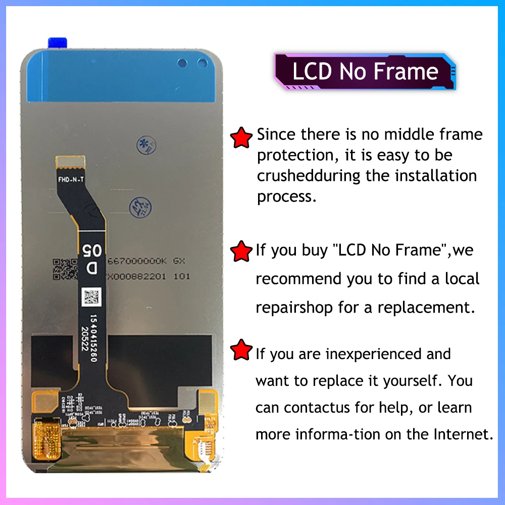 Écran LCD pour Huawei Honor 50 Lite Écran LCD pour Honor 50 Lite NTN-L22 NTN-LX1 NTN-LX3 6., 67 Pouces Remplacement Écran Tactile Digitizer Assembly avec Kit de Réparation (Noir avec Cadre) Caractéristiques du produit : Dépasse les attentes avec des écrans LCD avancés de qualité AAA Remplace l'écran LCD cassé, endommagé, fissuré et inutilisable. LCD pour Huawei Honor 50 Lite : notre écran LCD est compatible avec Huawei Honor 50 Lite NTN-L22 NTN-LX1 NTN-LX3 6,67 pouces, ne s'applique pas à d'autres modèles. L'installation peut nécessiter des connaissances particulières et, en cas de doute, nous vous recommandons fortement de demander l'aide d'un professionnel., d. Nous vous recommandons de lire les instructions de remplacement de l'écran LCD pour Honor 50 Liteonline., c. Pour remplacer et réparer les écrans défectueux. Écran de haute qualité : notre remplacement d'écran pour Huawei Honor 50 Lite est fabriqué en verre de haute qualité et d'autres matériaux à cristaux liquides avec d'excellents pixels de couleur et une résolution. écran LCD Huawei NTN-L22 Écran Pour Honor 50 Lite/Honor X20 NTN-AN20 / Huawei Nova 8i NTN-L22 NTN-LX1 NTN-LX3 6.67" LCD Écran Tactile Digitazer Assembly Remplacement Avec Outils (Noir écran Huawei Honor 50 Lite Écran LCD De Rechange Pour Honor 50 Lite / X20 / Huawei Nova 2) Connectez l'écran à la terre pour éviter les dommages statiques. Avant de commander un remplacement, veuillez vérifier si le problème est lié au panneau LCD ou à l'écran tactile de votre téléphone., b. Le test de l'écran en connectant le câble flexible est une étape critique qui ne doit pas être négligée avant l'installation. Écran de haute qualité : notre remplacement d'écran pour Huawei Honor 50 Lite est fabriqué en verre de haute qualité et d'autres matériaux à cristaux liquides avec d'excellents pixels de couleur et une résolution. Pour remplacer et réparer les écrans défectueux Soyez prudent lors de l'installation, car une mauvaise manipulation peut endommager l'écran. Équipe de service client : pour les problèmes de qualité non causés par des facteurs humains, nous pouvons vous offrir un remplacement ou un remboursement. Si vous n'êtes pas familier avec le remplacement de l'écran, nous vous recommandons vivement de vous rendre dans un service de réparation professionnel pour éviter d'endommager accidentellement votre écran LCD pour Huawei Honor 50 Lite. Flex de Carga para Huawei Nova 8i / Honor 50 Lite / Honor X20 Original... La surface de l'écran est recouverte d'un film transparent, veuillez retirer le film après avoir vérifié l'installation pour vous assurer qu'il n'y a pas de problème. Si vous avez des questions sur le remplacement d'écran pour Honor 50 Lite, veuillez contacter notre équipe de service client et nous vous répondrons dans les 24 heures. Bien que l'outil fourni soit compatible avec la plupart des téléphones portables, certains utilisateurs peuvent avoir besoin d'outils supplémentaires pour répondre à des exigences spécifiques., e.