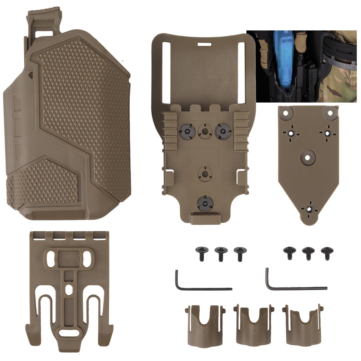 A1 - étui tactique rapide, support léger pour G17 - G19 et X300 lampes... 【Construction en nylon robuste 】: Fabriqué en nylon haute résistance de qualité supérieure pour une durabilité et des performances durables. 【Tension réglable】 : Utilisez la clé fournie pour régler la tension de l'étui en tournant la vis située à l'arrière. étui Pistolet Airsoft Qls TACWJDM Holster Universel Tactique X300 Avec Système De Dégagement Holster Nylon Dégagement Rapide Il est également compatible avec la lampe X300., 【Système QLS】 : Équipé d'une base d'adaptateur QLS, il permet une installation et un retrait rapides de l'étui. Ensemble QLS noir - étui tactique pour pistolet Glock 17 19 19x45... Caractéristiques :Installation facileDéverrouillage rapideGrande compatibilitéDurable et résistant à l'usureInclus : Étui + 3 adaptateurs (S/M/L) + outil de réglage TRIWONDER Étui à Pistolet Universel Holster de Cuisse Jambe de Combat