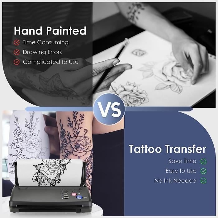 Thermocopieur Tatouage ORGBRO X8 Papier Transfert Tatouage 100 Feuilles, Papier Tatouage Papier Temporaire Imprimante Thermique Lot de 5 feuilles de papier tatouage teporaire A4 pour ipriante à Cococity 30 Feuilles A4 Papier Transfert pour Tatouage, Papier Tatouage... Papier transfert tatouage résistant aux plis : Le papier transfert tatouage possède une structure à 4 couches : Un papier de base blanc (papier tatouage temporaire imprimante), un film protecteur transparent (à retirer avant usage), un papier carbone bleu et un papier support jaune. Cela économise des étapes de travail et garantit des résultats lisses sans plis Il produit d'excellentes impressions de motifs avec des lignes précises pour un transfert cutané facile. ORGBRO Papier transfert tatouage : Format 105mm x 140mm, 100 feuilles par paquet. Impression & Dessin manuel : Ce papier tatouage temporaire imprimable permet une impression rapide et un transfert de motifs sur diverses surfaces (peau, bois, verre etc., ). Conseil d'application : Le papier transfert tatouage nécessite un gel de transfert (gel/lotion). Appliquez la lotion à pochoir, positionnez le motif et appuyez fermement au moins 3 secondes sur l'envers pour garantir un transfert optimal Ce kit de papier transfert MT660 est un excellent choix pour les amateurs de tatouage, les artistes et les tatoueurs professionnels. Il est livré avec 100 feuilles de papier transfert de format A4, qui peuvent être coupées en petites feuilles pour une utilisation plus flexible
