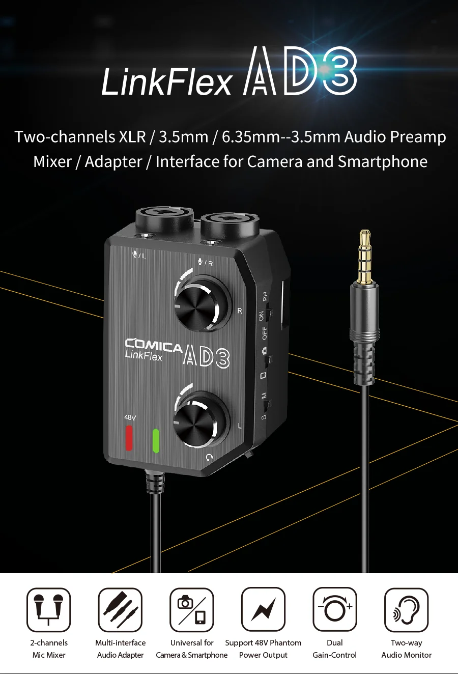 Commutateur mono et stéréo + Interrupteur d'alimentation fantôme 48 V. AD3 équipé d'une entrée XLR, d'une entrée instrument de 6,35 mm et d'une entrée jack de 3,5 mm, peut être utilisé avec un microphone professionnel ou des instruments de guitare, et se connecter à votre iPhone, iPad/PC, appareils photo avec le câble de sortie de 3,5 mm. Maintenant, vous pouvez commencer à enregistrer un son impressionnant. Deux entrées jack 3,5 mm. Fournit une alimentation fantôme de 48 V pour le microphone et comprend une sortie casque de 3,5 mm pour une surveillance en temps réel du son enregistré sur le téléphone et le microphone. Mezclador de interfaz Audio Comica Linkflex Ad3 Dual Smartphones Cor Preto Commutateur mono et stéréo : l'amplificateur de micro dispose de commutateurs audio mono ou stéréo. Deux entrées de guitare de 6,35 mm. COMICA AD3 est le meilleur assistant pour l'enregistrement vidéo Le mixeur audio LINKFLEX. Préampli Pour Smartphone Reflex COMICA Préampli De Microphone LINKFLEX.AD2 XLR / 6.35mm, Avec Alimentation Fantôme 48V, Moniteur Mixeur Pour Smartphone Appareil Photo Nicaa Adaptateur audio V2 XLR feelle vers TRS et TRRS 3,5 avec alientation fantôe pour... Remarque : pour iPhone 7 ou supérieur, vous devez utiliser l'adaptateur Lightning d'origine de l'iPhone. Plage de gain : augmentation maximale + 20 dB. Réponse en fréquence : 20 Hz à 20 kHz (+/- 1 dB)., THD + bruit : Sortie d'alimentation fantôme + 48 V : avec l'alimentation fantôme 48 V en option (fournie par une batterie de 9 V), cette table de mixage audio reflex numérique vous permet de connecter un micro dynamique ou un micro à condensateur à votre appareil. Adaptador De Audio Comica Linkflex Ad2 Preamplificador 48 V | Envío gratis 1 manuel d'utilisation (français non garanti). Caractéristiques principales : 2 canaux indépendants. Deux entrées micro XLR. Alimenté par une pile 9 V.