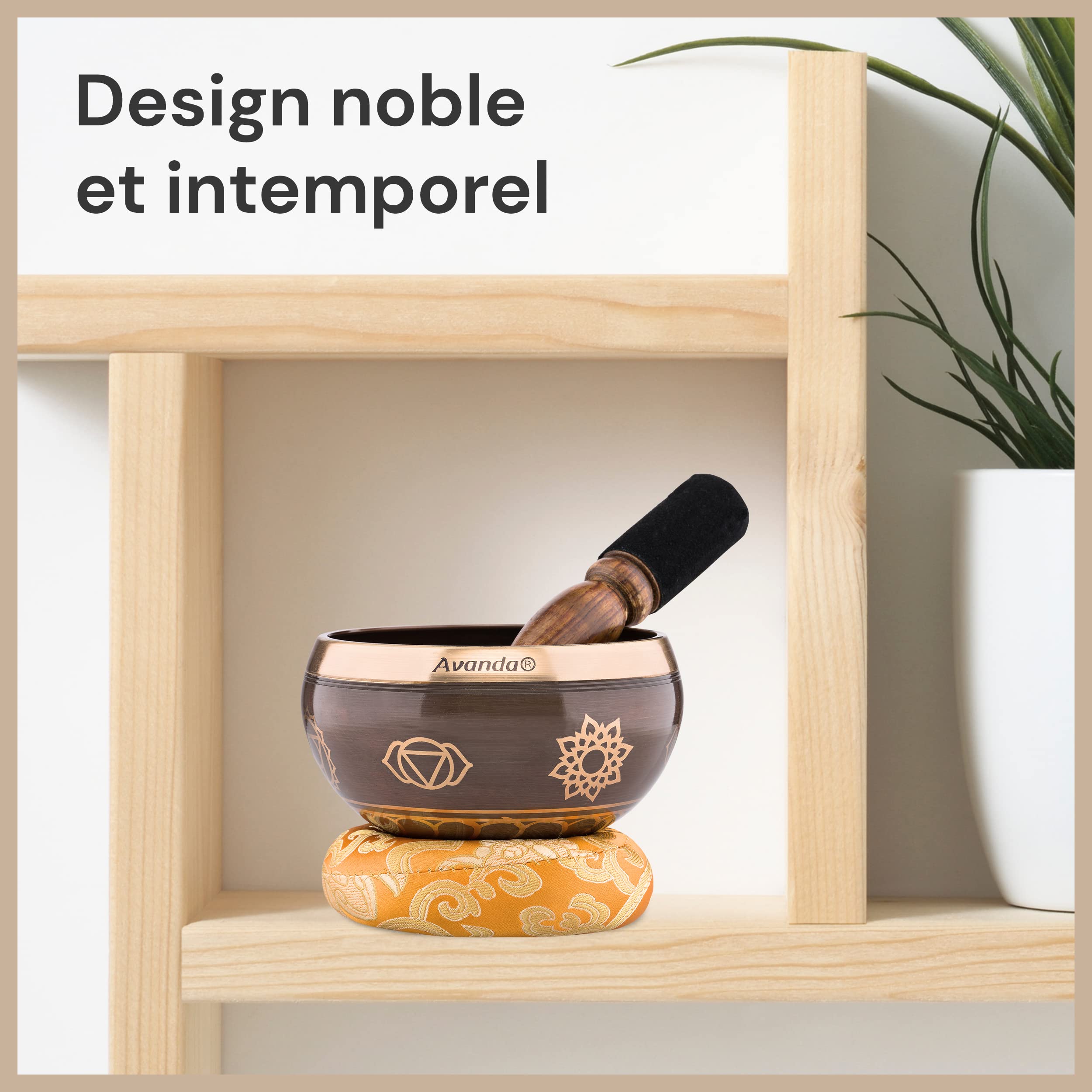 Finition de la surface Bol Chakra Méditation Relaxation Bol Chantant Tibétain Fleur De Vie Pour Yoga, Méditation Et Relaxation, Diamètre 10 Cm, 400 G, Surface Antique, Fait à La Main Bol Tibétain 7 Métaux Le profil parfaitement rond assure une qualité sonore particulièrement agréable que vous entendrez et ressentirez. Regardez la vidéo du produit Qualité et fabrication équitable : le bol chantant tibétain Avanda est fabriqué à la main avec beaucoup de passion. Que ce soit pour un usage professionnel ou chez vous : le beau design intemporel s'adapte à toutes les pièces et dégage calme et sérénité. Bol tibétain en aluminium pour la méditation et l'aromathérapie, idéal Sac en soie pratique au design assorti Avec cet ensemble de bols chantants tibétains, vous trouverez la paix intérieure, la détente et la sérénité pendant le yoga, la méditation et votre pratique quotidienne de pleine conscience. Métal fondant et martelant Le livret d'instructions fourni vous offre une aide précieuse pour un démarrage immédiat, même sans connaissances préalables. Exactement ce qui manque souvent au quotidien Bol Chantant vert chakra du coeur, arbre de vie. NOTE FA Le kit complet inclut : le bol, un maillet double face (cuir pour frotter, feutre pour frapper), un coussin anneau pour le stabiliser, un sac de transport en... Coussin en forme d'anneau pour un positionnement sûr Instructions pour des sons agréables et apaisants Le kit comprend tout ce dont vous avez besoin pour commencer directement dans un design unique fabriqué à la main traditionnel tibétain. Mailloches doubles avec feutre et revêtement en cuir