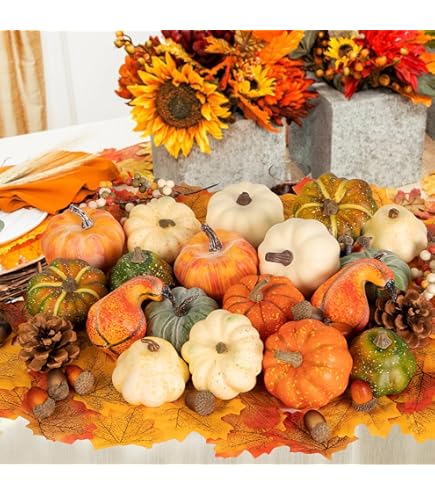 Halloween Decoration Citrouille Ywlake Lot De 12 Citrouilles Artificielles Décoratives En Toile De Jute Décoration Table Centre De Table Automne Citrouille déco floquée orange clair décoration automne ENSEMBLE DE CITROUILLES COMPLET - L'ensemble comprend 12 artificielles citrouilles de tailles assorties (1*XL, 1*L, 3*M, 3*S, 4*XS), toutes emballées de... Les citrouilles et les feuilles d'érable peuvent être dispersées au hasard sur la table ou dans un coin de la maison. 🎃ENSEMBLE DE CITROUILLES COMPLET - L'ensemble comprend 12 artificielles citrouilles de tailles assorties (1*XL, 1*L, 3*M, 3*S, 4*XS), toutes emballées de manière sécurisée. 🍂DIFFÉRENTES TAILLES - 1 citrouille X-Large (21*15cm), 1 Large(15*9., 5cm), 3 Medium(10*9cm), 3 Small(7*6., 5cm), 4 X-Small(5*6cm ). Décoration De Citrouilles Artificielles Pour Thanksgiving Couleur : Orange Matériau : Mousse Taille des citrouilles : 1 XL Citrouille: 21*15cm 1 L citrouille : 15cm*9., 5cm 3 M Citrouille: 10*9cm 3 S citrouille : 7cm*6., 5cm 4 Citrouille XS: 5cm*6cm Large application : Ces citrouilles artificielles et ces feuilles d'érable seront une décoration parfaite pour les magasins de fruits ou les magasins d'alimentation pendant la récolte. 🍁COULEURS VIBRANTES - Ces fausses citrouilles ont des formes classiques, peintes en orange vif avec des mouchetures et des lignes jaunes, chacune avec une tige brune. Ajoutez une touche de fraîcheur à votre décor d'automne, d'action de grâces et d'Halloween. Ces fausses citrouilles durables élèvent les décorations dans les boulangeries, les supermarchés ou les séances de photos, capturant l'esprit festif de la récolte. Halloween - Citrouille Géante