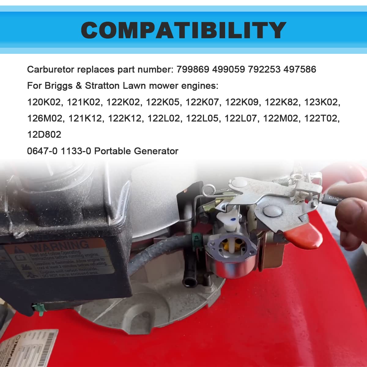 ZAMDOE 799584 Carburateur 592361 594057 594058 594529 Remplacement pour Carburateur de tondeuse à gazon, remplacement 799869 792253 497586... Kit Carburateur Briggs Stratton ZAMDOE 499059 Filtre à Air De Carburateur Pour Briggs Filtre à Air 499059 Contenu de l'emballage : 1 carburateur, 1 joint torique, 1 joint, 1 filtre à air, 1 préfiltre, 1 bougie d'allumage, 1 tuyau de carburant, 1 poire d'amorçage, 1 valve d'arrêt de carburant, 1 x Filtre à carburant, 4 x Pince. Convient pour Briggs and Stratton les moteurs de la série 121XXX 122XXX 123XXX 12D800 123K00 120000 122000 121000 125000 avec starter, pour les moteurs à arbre vertical avec starter. KIT CARBURATEUR POUR Briggs & Stratton Quantum 498170 799868 498254... Le carburateur remplace le numéro de pièce : 799869 499059 792253 497586, le filtre à air remplace # 491588s 399959 491435S 4101 5043 5043A 5043D 5043H 5043K Pour les moteurs de tondeuse à pelouse B&S 120K02, 121K02, 122K02, 122K05, 122K07, 122K09, 122K82, 123K02, 126M02, 121K12, 122K12, 122L02, 122L05, 122L07, 122M02, 122T02, 12D802; Génératrice portative 0647-0, Génératrice portative 1133-0 Emballage inclus : 1 x carburateur, 1 x joint torique, 1 x joint, 1 x filtre à air, 1 x pré-filtre, 1 x bougie d'allumage, 1 x tuyau de carburant, 1 x poire d'amorçage, 1 x vanne d'arrêt de carburant, 1 x filtre à carburant, 4 x pince. Veuillez vérifier le numéro de pièce et la taille du carburateur avant de passer commande, ce carburateur est 799869 ; Veuillez vérifier le modèle et les numéros de pièces de votre moteur avant de commander les pièces.