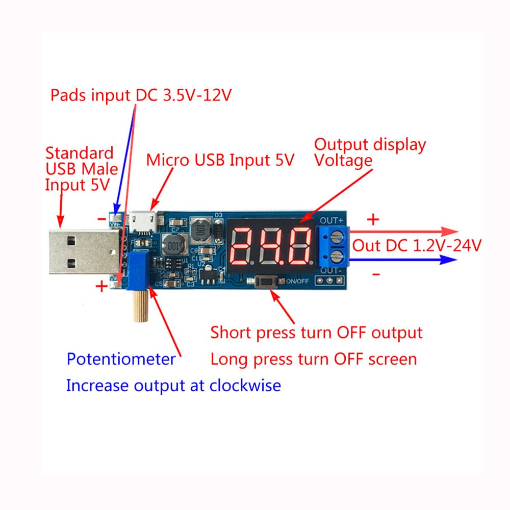 Output: plug in USB or micro USB can easily output adjustable voltage from 1V to 24V and the power is 3W Data storage: automatically save the state before the power failure, the output data will not be lost. SHAHIDEER MT3608 Step Up Boost Power Converter Módulo de Avance con Micro USB DC-DC 2A Max 2V... DC-DC 5V - 3.5V / 12V USB lépéses fel/le tápegység modul, állítható Voltage Regulator Buck Converter ZkeeShop 2Pcs Buck Converter Module 12V To 5V 5A USB Voltage Convertisseur Buck Boost Usb