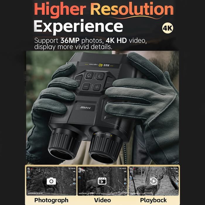 Vitesse d'obturation : 1/10s-1/2650s., Poids net : 210 g. Monoculaire Sightmark de Vision Nocturne WRAITH 4K - Montage pour... Zoom numérique 28x pour la capture photo et vidéo : atteignez des sujets éloignés avec un impressionnant zoom numérique 28x, offrant une polyvalence pour la photographie et la vidéographie sur différentes distances, de la visualisation à courte portée aux paysages lointains. Résolution vidéo : 4K, 2K, 1080p, 720p. Monoculaire Enregistrement Photo Vidéo Monoculaire De Vision Nocturne - FNIRSI - NVS-40 - 6x Zoom Numérique - 4K HD - 300m Portée Nocturne - Appareil Photo Pour Observation Nature Camping 1 mode d'emploi (français non garanti). Caractéristiques : * Résolution vidéo 4K : ce monoculaire ForNIGHT VISIONS capture de superbes vidéos 4K, que vous ne manquerez jamais aucun détail, même dans des conditions de faible luminosité, ce qui le rend parfait pour l'observation de la faune ou les aventures nocturnes. Contenu de l'emballage : 1 x pour vision nocturne., 1 dragonne., 1 chiffon de nettoyage., 1 câble de charge. Longue durée de vie de la batterie pour monoculaire de vision nocturne : alimenté par une batterie intégrée robuste de 3600 mAh, profitez de jusqu'à 8 heures de fonctionnement continu, vous permettant d'explorer ou d'enregistrer des événements pendant de longues périodes sans vous soucier de manquer d'énergie. Design compact et léger : ne pesant que 210 g et mesurant 148 x 70 x 52 mm, ce monoculaire se glisse facilement dans votre sac ou votre poche ; confortable à transporter avec la dragonne incluse, ce qui le rend parfait pour les voyages, le camping ou la randonnée. Résolution d'image : 64 à 8 Mo. Mémoire maximale : 128 Go (non incluse). RUMOCOVO® Monoculaire à Vision nocturne 1080P HD, dispositif infrarouge... * Longue durée de vie de la batterie : doté d'une batterie intégrée robuste de 3600 mAh, cet appareil offre environ 8 heures d'utilisation continue, permettant de longues périodes d'exploration sans vous soucier de manquer d'énergie. Écran IPS clair et convivial Caractéristiques : L'écran IPS de 1,54 pouces offre des aperçus et une lecture vifs ; prend en charge jusqu'à 128 Go de stockage (carte non incluse) avec réglage manuel de la mise au point et 7 niveaux de luminosité pour un confort visuel amélioré dans toutes les conditions. Monoculaire vision nocturne HD avec zoom 5X