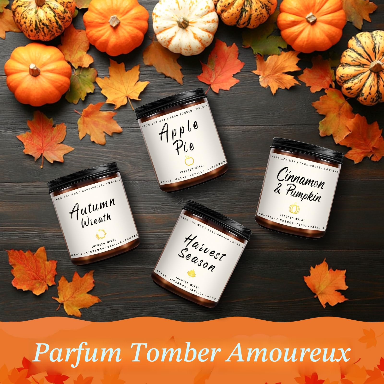 Lot de 4 bougies parfumées pour femme, cire de soy wax belles bougies Allumez-en une et transformez n'importe quel espace en une retraite automnale chaleureuse. Cadeau Automne Femme Lot De 4 Bougies D'automne Parfumées – Bougies De Soja D'automne Pour La Maison, Cadeaux D'aromathérapie Pour Décoration D'automne De Citrouille/pomme/latte/récolte Bougies Décoratives Verre Orange Huiles de parfum de première qualité: Contrairement aux parfums artificiels, ces bougies en cire de soja utilisent des huiles essentielles de première qualité, telles que la cannelle de Ceylan, l'épice de citrouille fraîche et l'essence de pomme du verger, pour un arôme authentique et varié. Coffret cadeau 3 bougies parfumées artisanales – Amécla Matériaux de la cire de soja : ces bougies parfumées en forme de citrouille sont fabriquées en cire de soja naturelle, elles ont une odeur sûre, une structure... Cadeau d'automne parfait pour toutes les occasions: Magnifiquement emballé et prêt à être offert, ce set de bougies d'automne en forme de citrouille constitue un cadeau attentionné pour les hôtes, les amis ou la famille. Peut être utilisé dans les chambres à coucher, les salles de bains, les salons, etc. Que ce soit pour Thanksgiving, la pendaison de crémaillère ou pour prendre soin de soi, c'est une façon délicieuse de célébrer la saison Les porte-bougies en verre rehaussent la lueur vacillante, ce qui les rend parfaites pour les dîners de Thanksgiving, les rassemblements d'automne ou les soirées de détente L'électrodéposition permet d'obtenir une fine étincelle lors de l'allumage. 3 parfums d'automne en un seul set: Laissez-vous séduire par les arômes douillets de l'automne grâce à cet ensemble de bougies parfumées d'automne: épices de citrouille, couronne de sucre d'érable, tarte aux pommes.