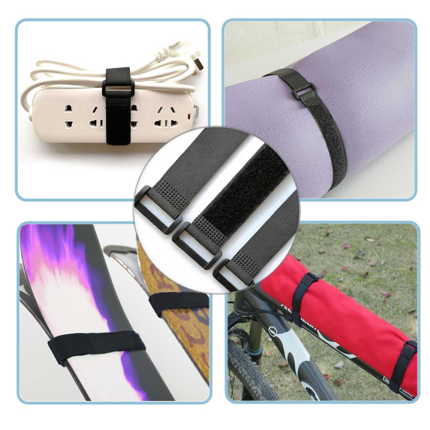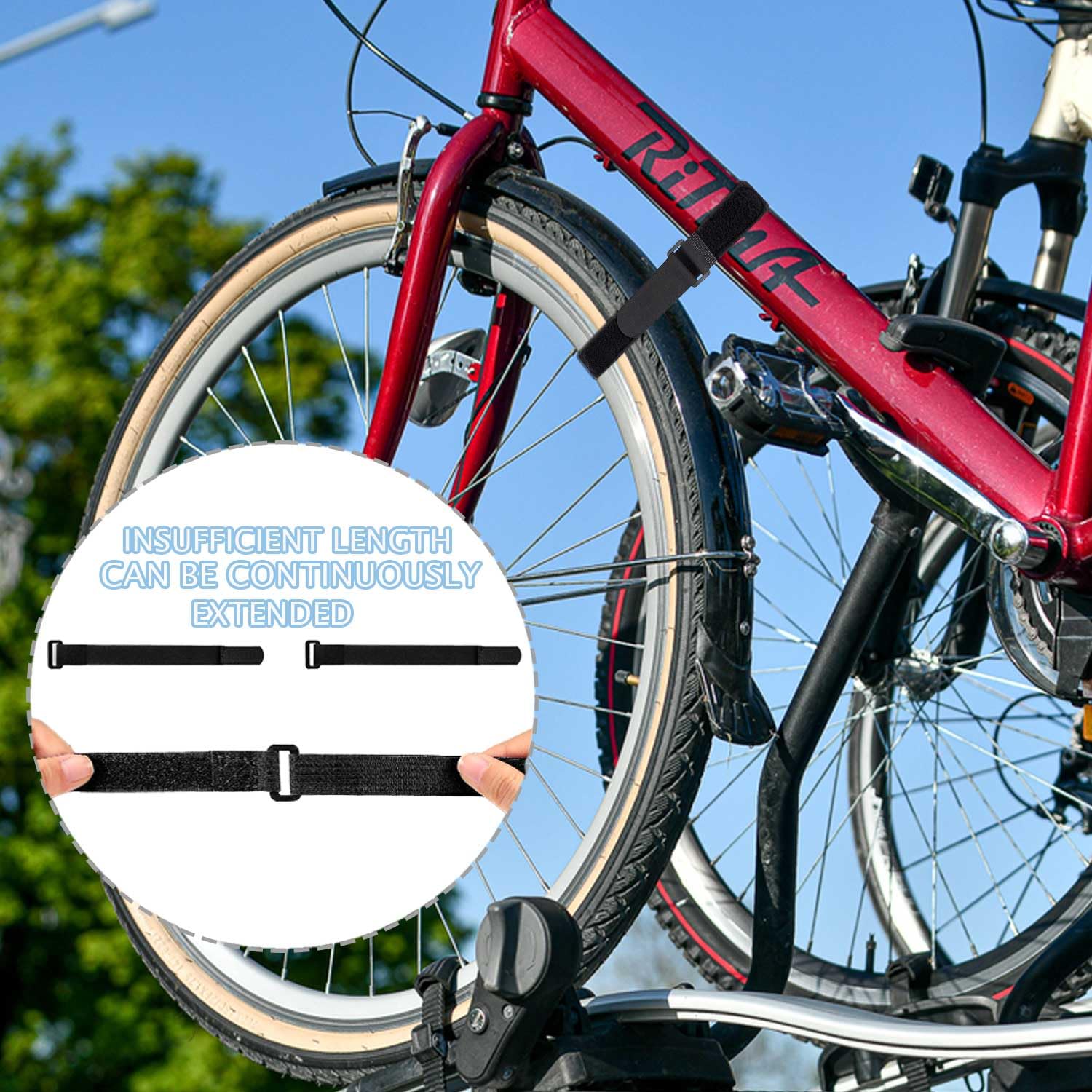 Sangles Anti-rayures YUBBYSTU 8pièces Sangles De Porte-Vélos,avec Sangle De Stabilisation De Roue De Vélo Réglable Avec Crochet Et Anneau Pour Voiture Et Montage Mural Pour Le Transport Et Le Stockage, Noir (26 "x 1,5 Sangles Velcro Transport Vélo TAM Sangles de porte-vélos Bande de sangle de pompe à vélo Bande de Sangles (lot de 2) Auto-adhésives 80cm - Stabilisateur de roue... Conçues en polyamide résistant avec un Velcro industriel, elles supportent jusqu’à 20 kg. Utilisation possible pour fixer du matériel de sport ou randonnée Stabilisation sécurisée des roues pour le transport et le rangement: Ces sangles ajustables empêchent efficacement les roues de tourner ou de bouger pendant le transport ou le stockage, évitant ainsi les rayures ou dommages sur le cadre de votre vélo Les sangles stabilisatrices pour vélo assurent un maintien efficace pendant le transport ou le rangement. Taille M parfaite – 61 cm de longueur et 26 cm de diamètre enroulé: Avec une longueur de 61 cm et un diamètre de 26 cm une fois enroulée, cette sangle de taille M convient à la plupart des vélos, y compris VTT, vélos de route, vélos pour enfants et fatbikes à pneus larges Nylon industriel avec fermeture Velcro résistante: Fabriquées en polyamide résistant avec une fermeture Velcro de qualité industrielle, ces sangles assurent une fixation fiable même sur des routes accidentées ou lors de trajets prolongés Utilisation polyvalente pour vélo et équipements extérieurs: En plus de fixer les roues, ces sangles sont parfaites pour attacher des guidons, pompes à air, bouteilles d’eau, tapis de yoga ou accessoires de randonnée – un accessoire multifonction indispensable Nos sangles stabilisatrices de roue de vélo sont des sangles de rechange en caoutchouc pour de nombreuses marques de berceaux. [Sangle porte-vélo] : vous pouvez facilement utiliser ces sangles de porte-vélos pour répondre à vos besoins. En cas de problème, contactez-nous et nous ferons le bon choix